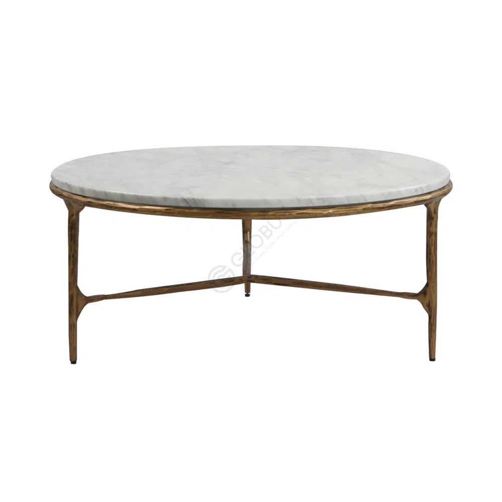 Контрастной, но гармоничной основой служит изящный каркас из железа. Его поверхность обработана вручную, создавая эффект состаренного золота или патинированной бронзы, что привносит глубину и уникальность. Тонкие, но прочные опоры формируют устойчивую конструкцию, не утяжеляя общий вид.