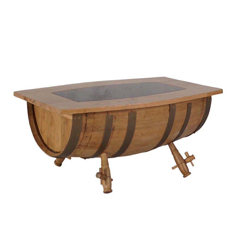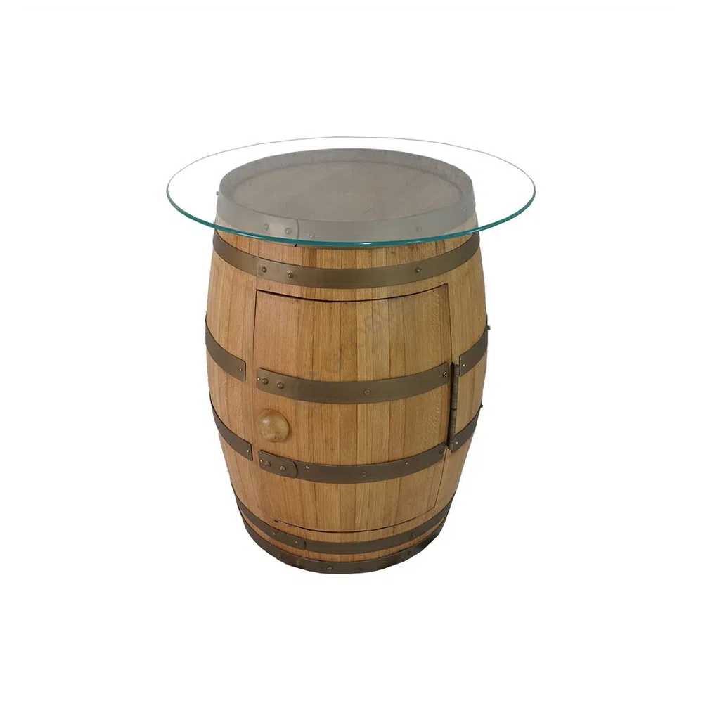 Основание столика выполнено из натурального дерева, чей неповторимый рисунок и теплая текстура создают атмосферу уюта и благородства. Само основание, повторяющее очертания классической бочки, придает предмету особую харизму. Брутальные металлические обручи эффектно контрастируют с гладкой древесной поверхностью, подчеркивая индустриальный характер.