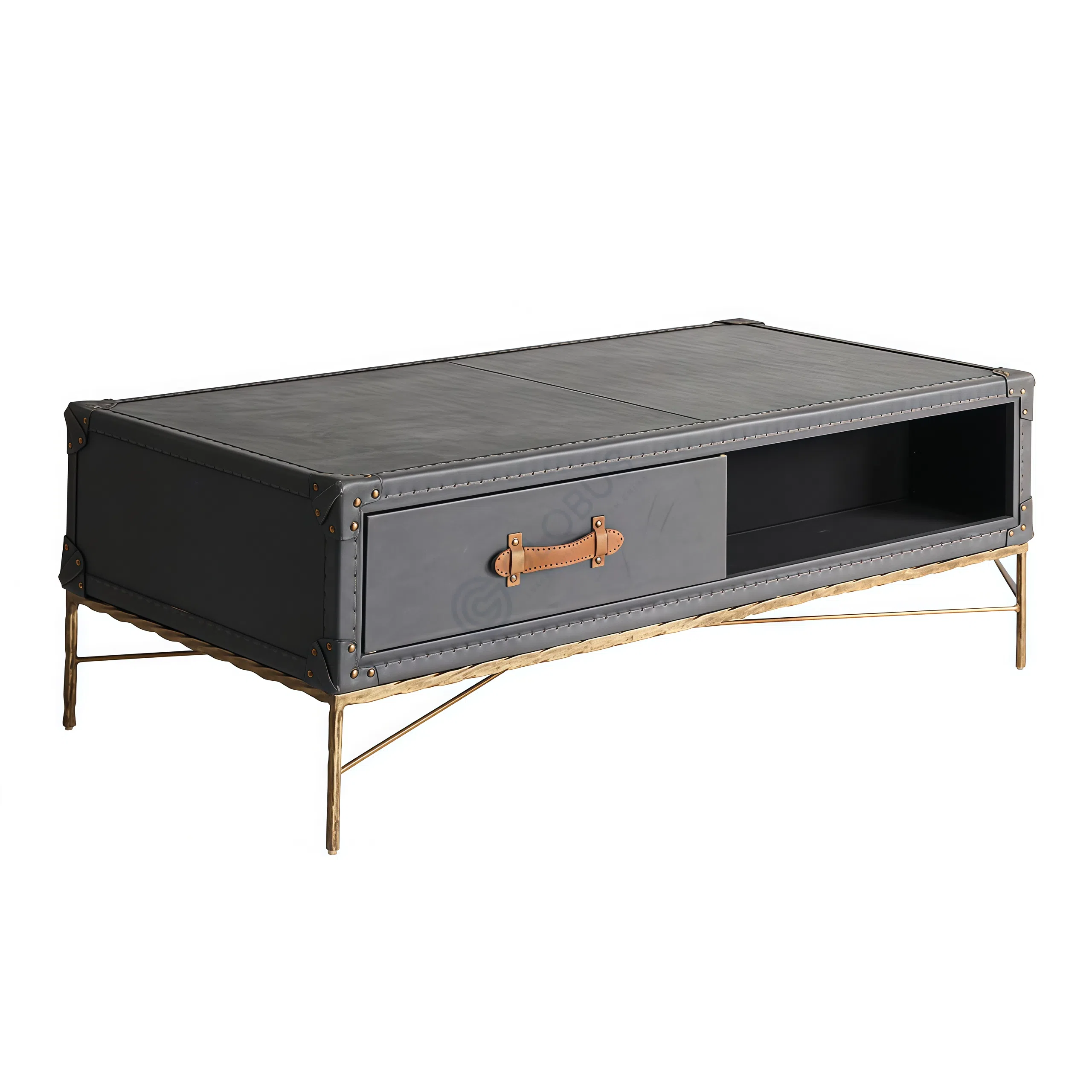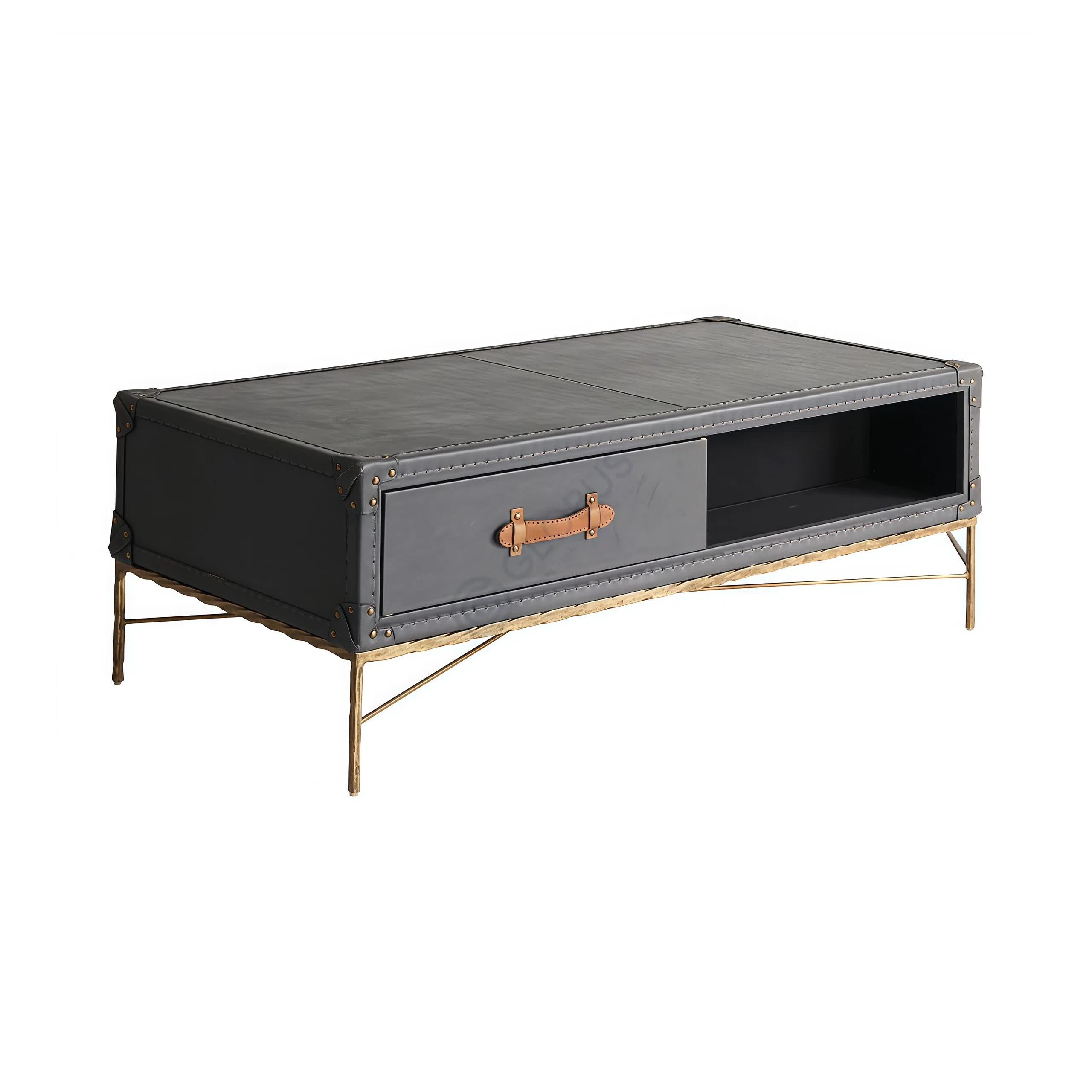 Корпус предмета элегантно обтянут высококачественной кожей графитового оттенка, подчеркнутой аккуратной строчкой и прочными металлическими заклепками по углам. Две функциональные выдвижные секции оснащены необычными ручками из натуральной кожи коньячного цвета, добавляющими контрастный акцент и тактильное удовольствие при каждом использовании.