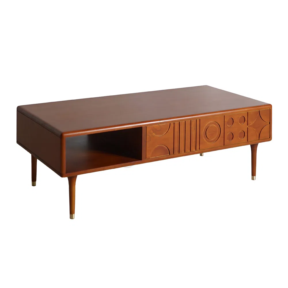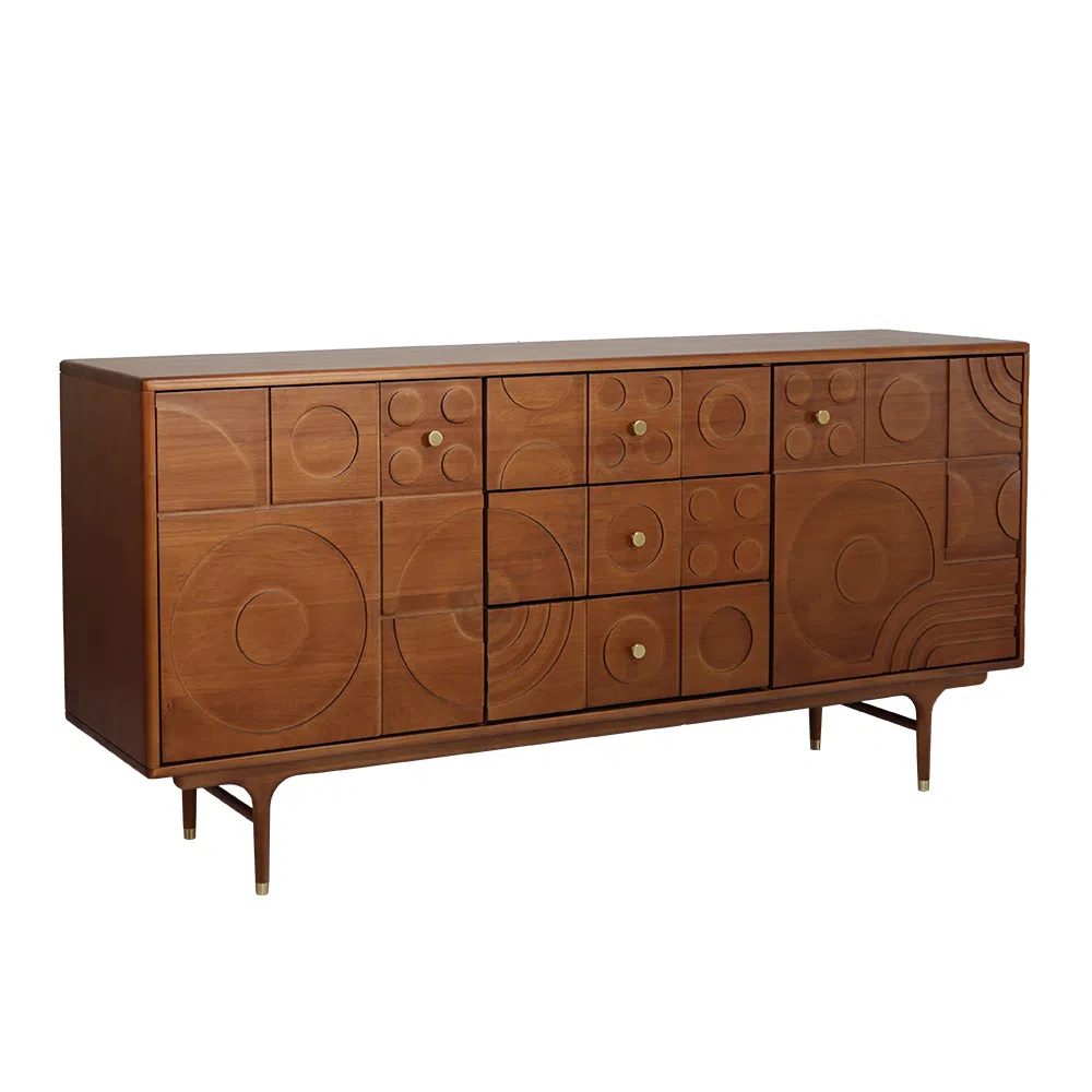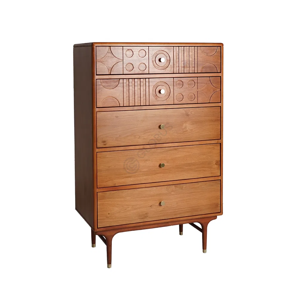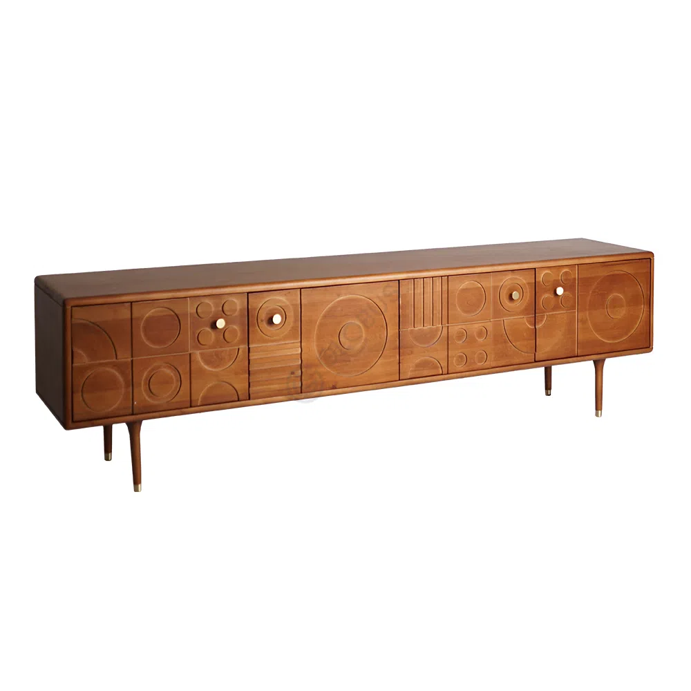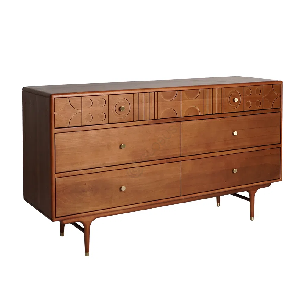 Особое внимание привлекают фасады ящиков, украшенные выразительным рельефным рисунком. Центральная секция выделяется круговым орнаментом, а боковые элементы дополнены органичными изогнутыми линиями, создавая неповторимую тактильную и визуальную фактуру. Изящные конические ножки с деликатными латунными наконечниками добавляют конструкции легкости и завершенности, подчеркивая мастерство исполнения. Открытая ниша и вместительные отделения для хранения обеспечивают удобство размещения личных вещей.