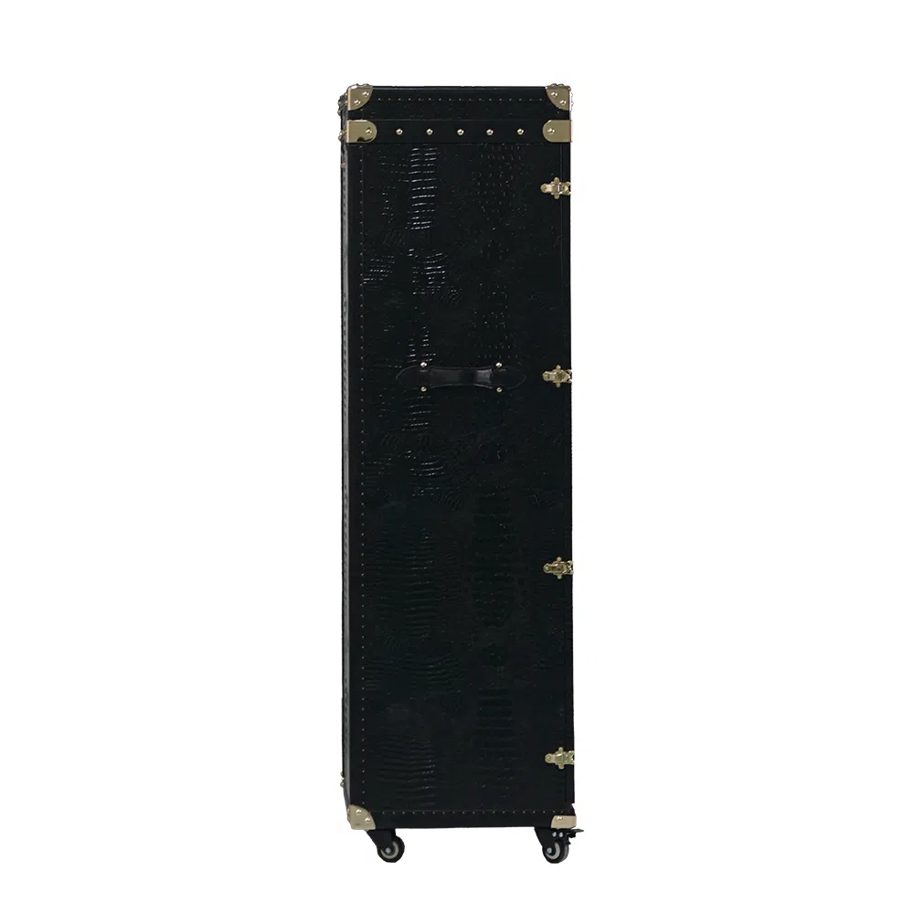 Внешний облик этого предмета мебели поражает своей респектабельностью. Высококачественная экокожа с выразительным тиснением под крокодиловую кожу глубокого черного оттенка придает ему особенный характер и шик. Металлические элементы, расположенные по периметру и на замках, подчеркивают индустриальную эстетику и добавляют винтажного очарования, в то время как крепкие колесики обеспечивают удобство перемещения. В основе конструкции лежит натуральное дерево, гарантирующее надежность и долговечность.