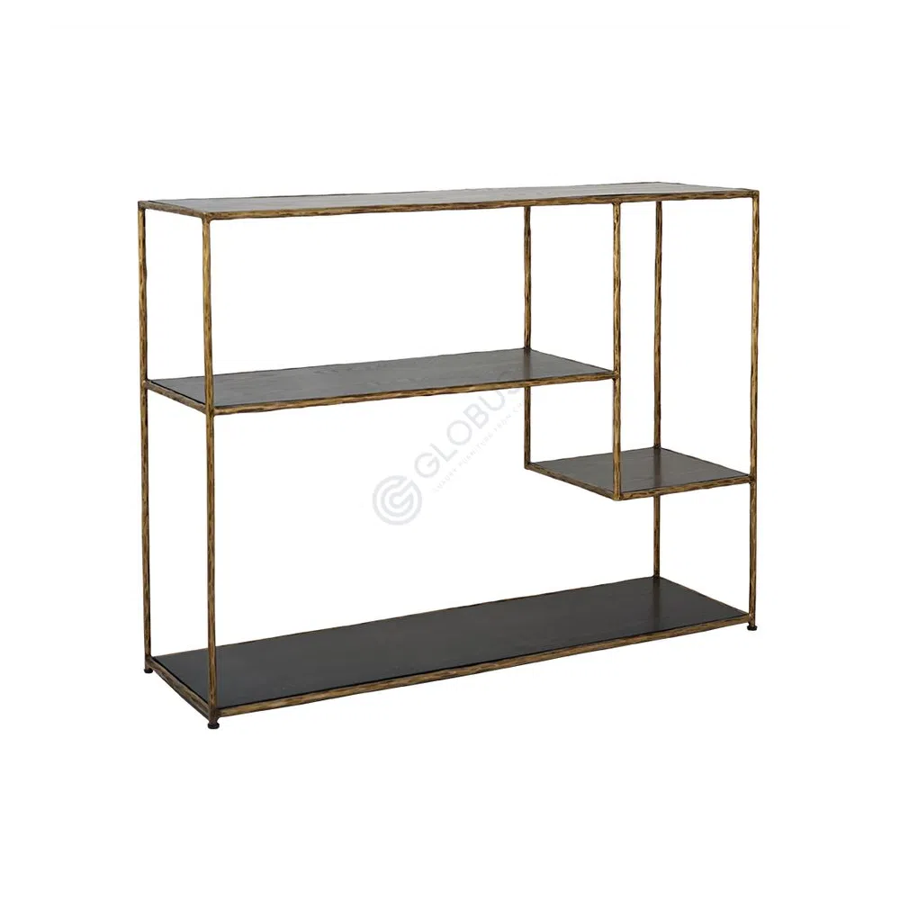 Это изделие представляет собой воплощение современного искусства и функциональности. Его изящный силуэт, созданный из прочного кованого железа с изысканной патинированной отделкой, мгновенно притягивает взгляд. Контраст между тонким каркасом и прозрачными стеклянными полками создает ощущение невесомости и открытости.