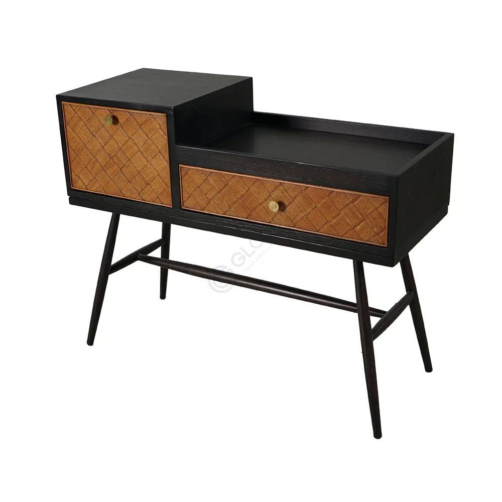 Фасады шести вместительных ящиков выполнены из природной древесины, которая приобретает особый характер благодаря уникальному узору, напоминающему искусное плетение. Этот рельефный рисунок создаёт динамичный визуальный эффект, добавляя объёма и глубины. Деликатные латунные ручки, расположенные в центре каждого фасада, завершают ансамбль, привнося изысканный акцент.