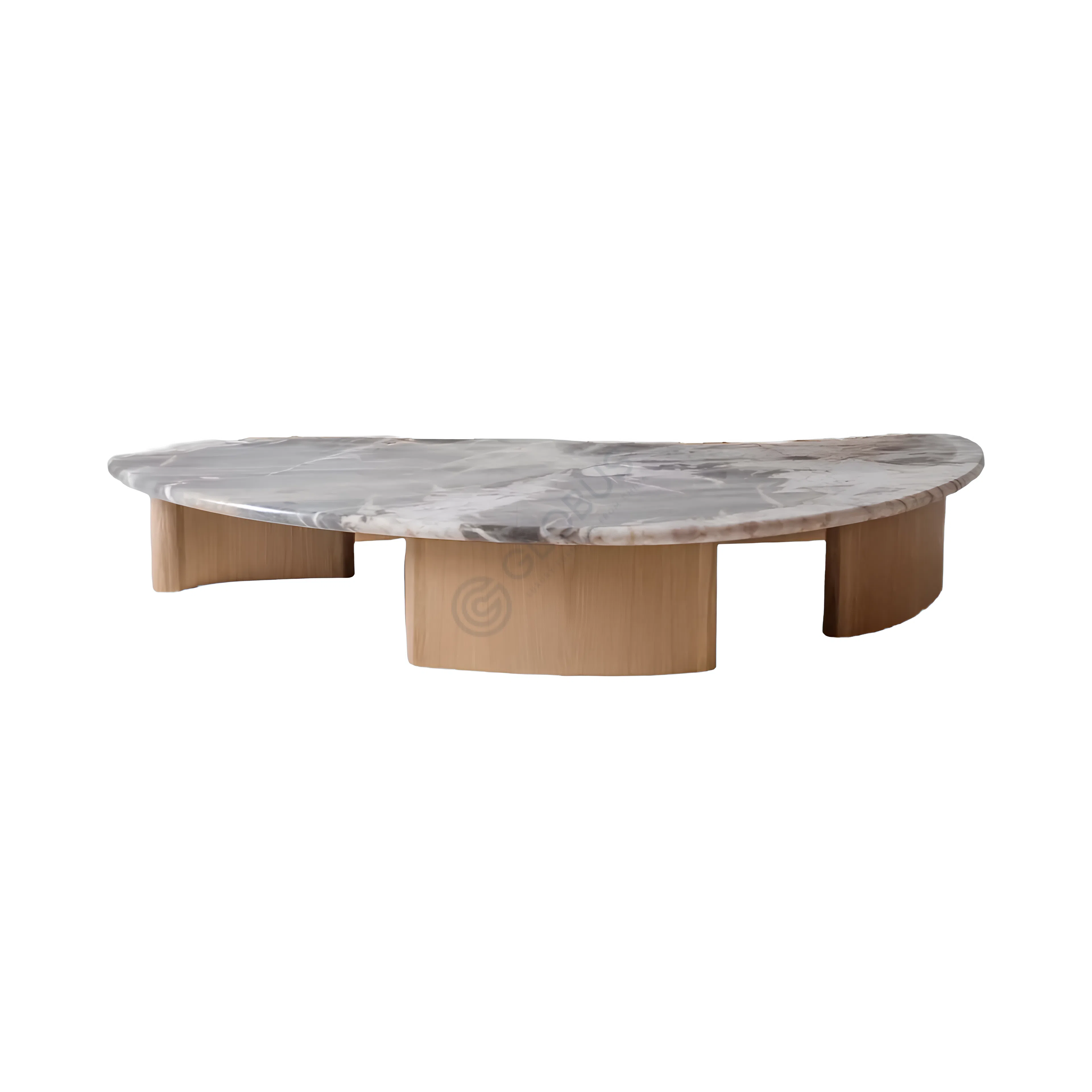 Этот журнальный столик воплощает собой гармоничное сочетание природной красоты и современного дизайна. Его выразительная столешница с плавными, асимметричными линиями из натурального травертина привносит в интерьер ощущение спокойствия и утонченности. Каждое изделие уникально благодаря неповторимому узору камня.