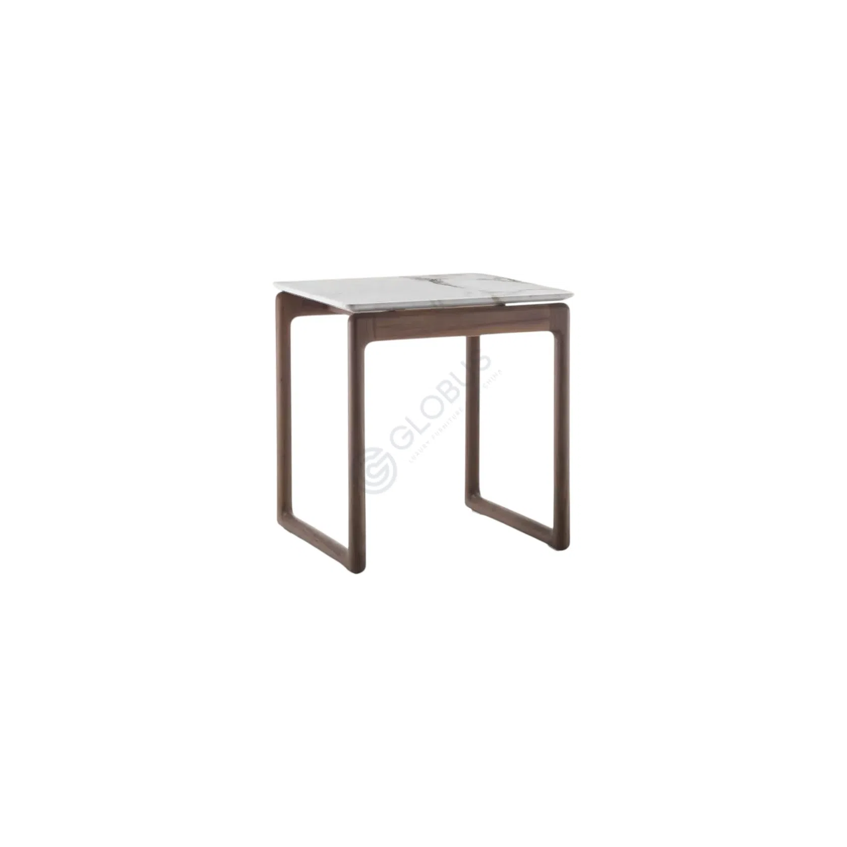 Тонкая столешница с аккуратными гранями создаёт ощущение лёгкости, а устойчивые опоры из натурального дерева обеспечивают надёжность эксплуатации. Каждая деталь конструкции выполнена с тщательной обработкой поверхности, что подчёркивает высокое качество материалов.