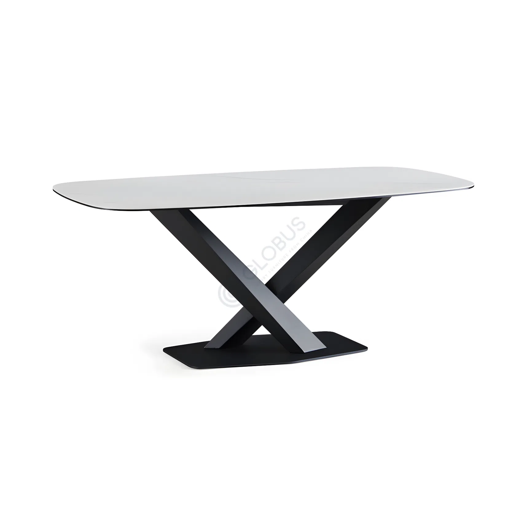 Верхняя часть изделия выполнена из спеченного камня, который визуально напоминает благородный мрамор, обладая при этом исключительной долговечностью и устойчивостью к повседневному износу. Тонкий слой стекла, интегрированный в поверхность, придает дополнительную глубину и изысканное сияние, подчеркивая естественный рисунок камня. Особое внимание привлекает основание: две изящные опоры из углеродистой стали, пересекающиеся в динамичной X-образной форме, создают эффект легкой, но надежной конструкции. Матовый черный оттенок стали контрастирует с нежным узором столешницы, добавляя графичности и современности.