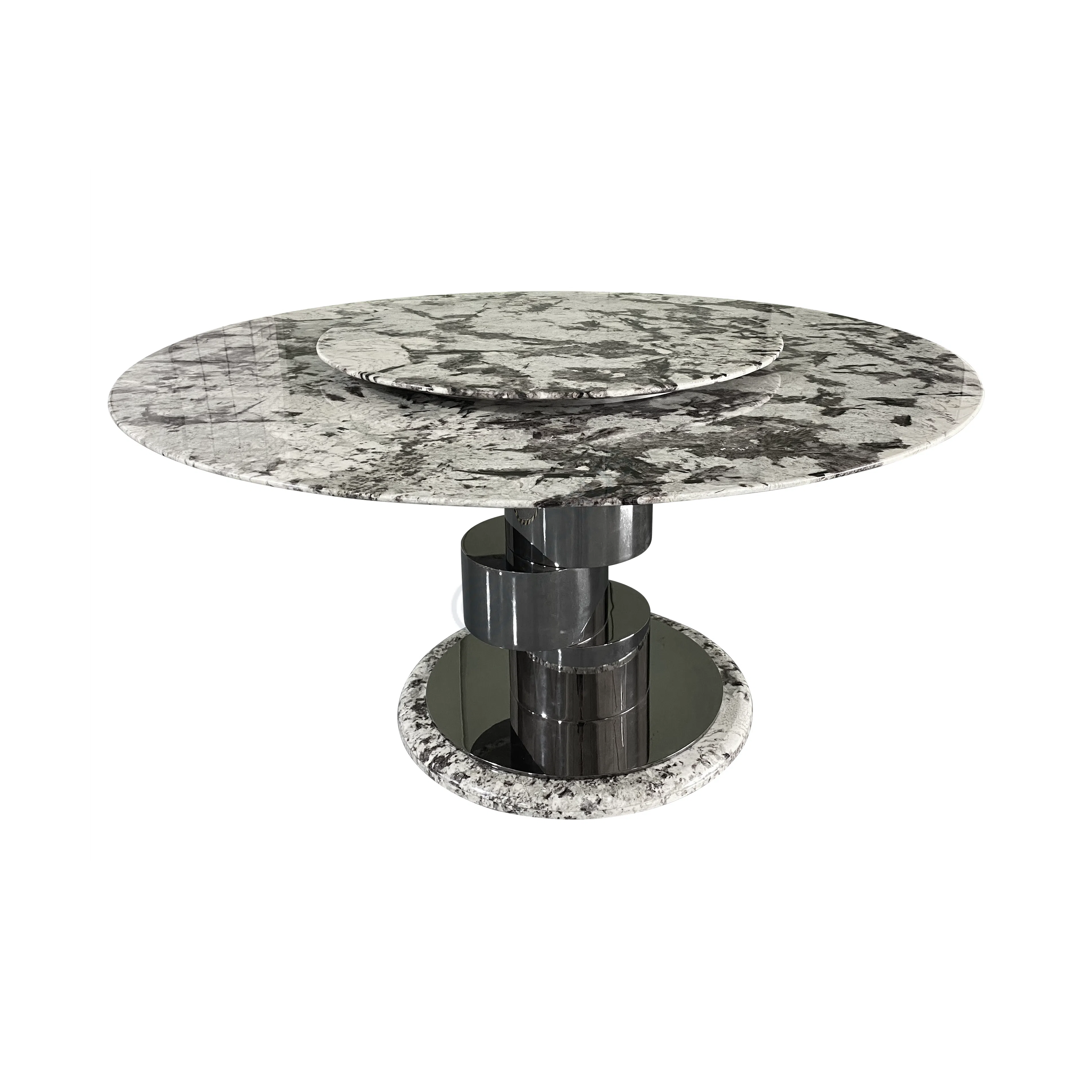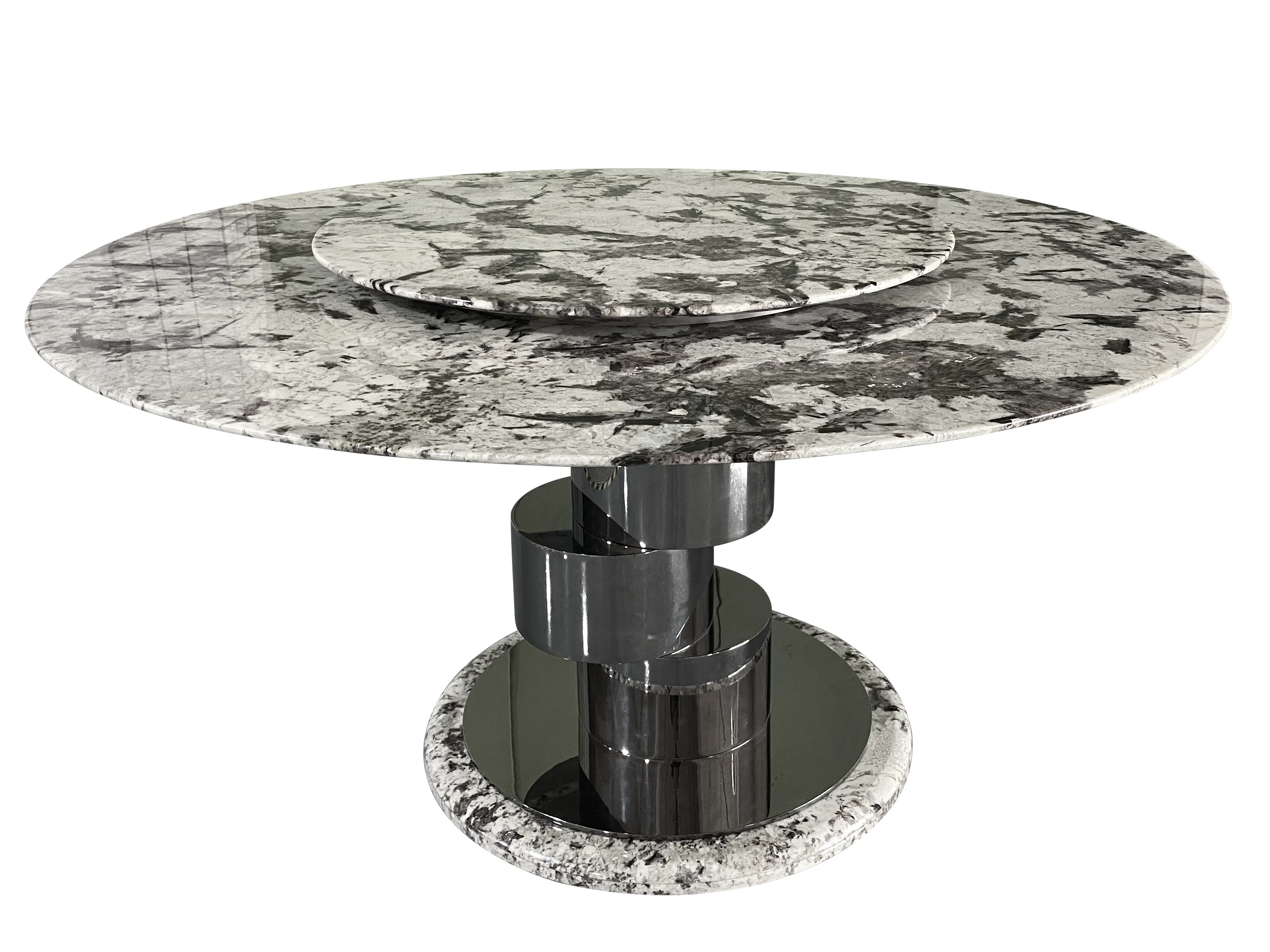 Центральная опора консоли выполнена из полированной нержавеющей стали, чьи цилиндрические элементы словно обнимают друг друга, формируя динамичную спиралевидную колонну. Этот дизайнерский прием придает конструкции самобытность, делая её не просто мебелью, а настоящим арт-объектом. Столешница и основание из натурального камня привлекают внимание своим неповторимым рисунком, где каждый прожилок рассказывает историю природы, внося уникальность в каждую деталь.