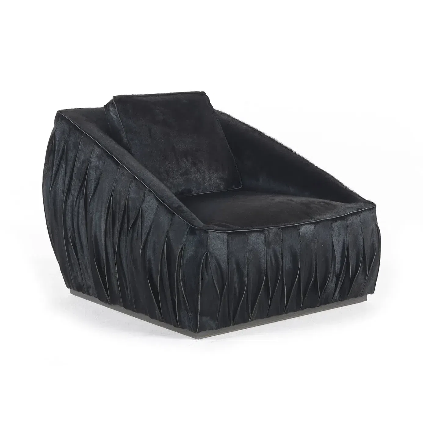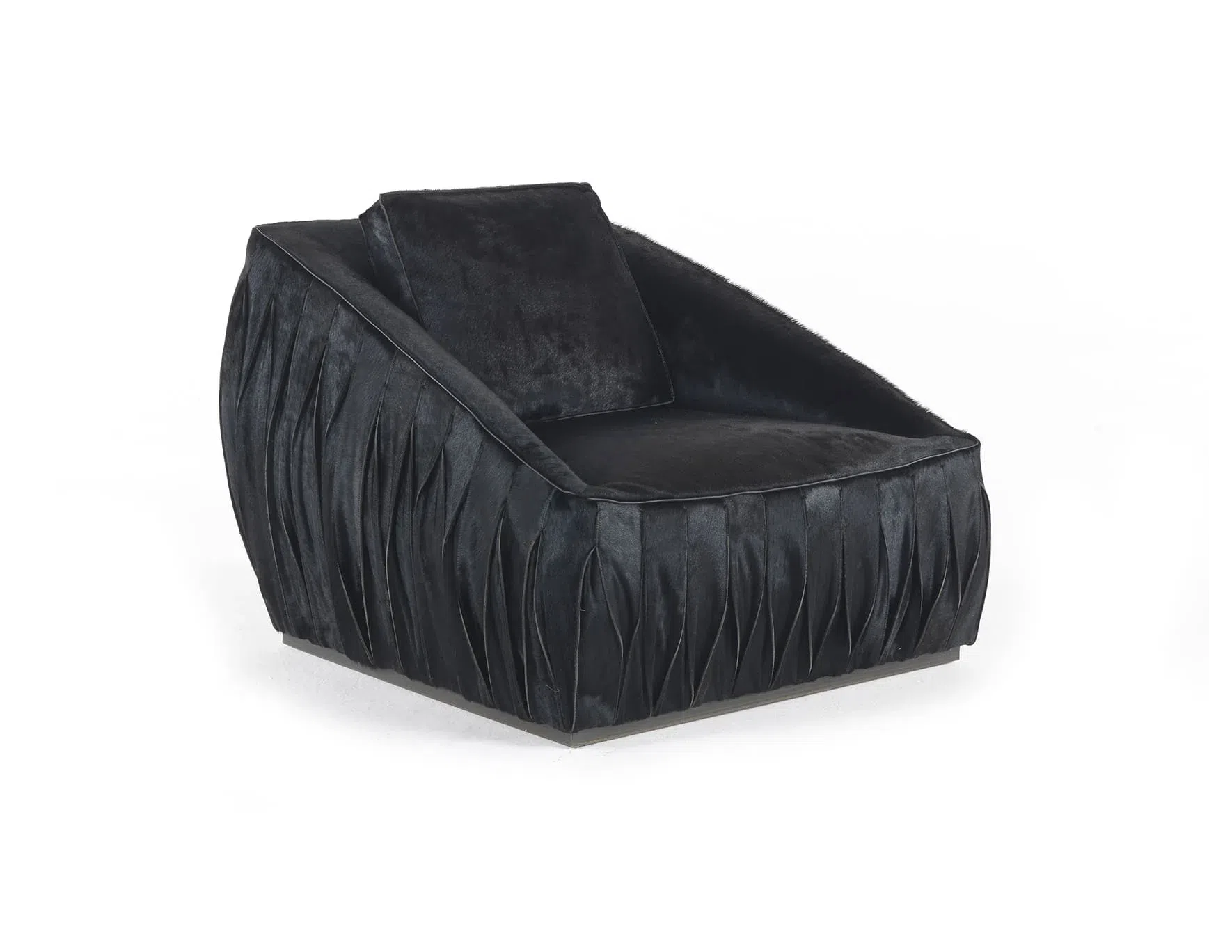 Каркас изготовлен из натурального дерева с усилением из фанеры, опирается на тонкую рамку из нержавеющей стали. Обивка из мягкой замши придаёт поверхности благородную текстуру и тактильный комфорт. Подушка с животным принтом в золотистых тонах выступает выразительным акцентом.