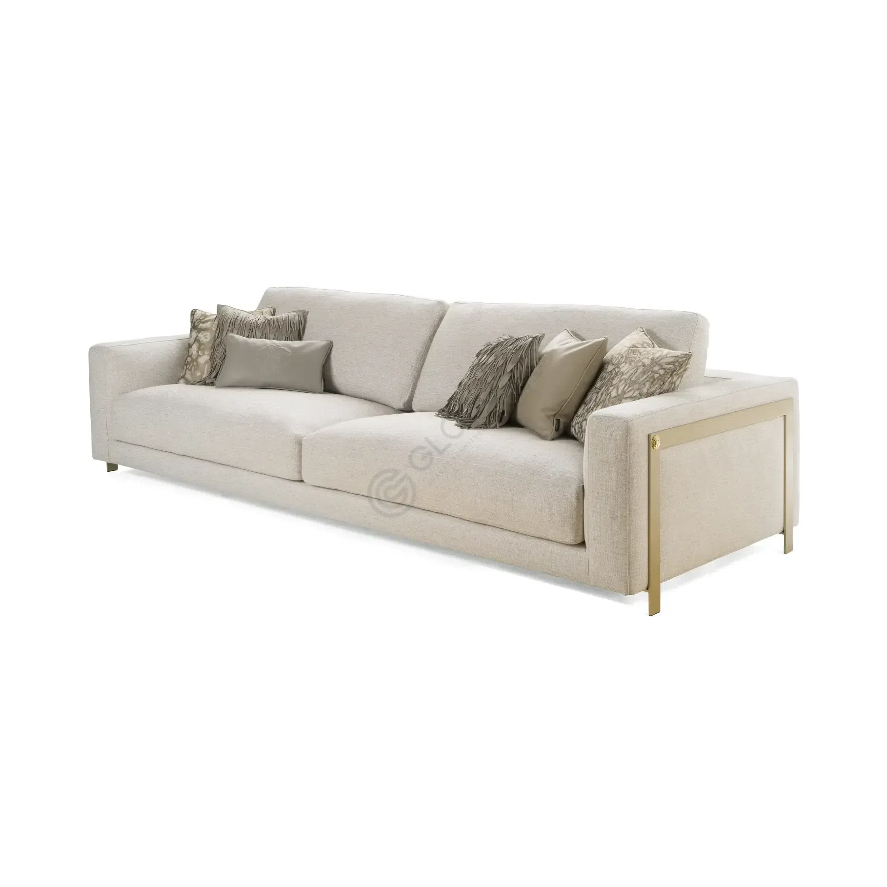 Обивка из высококачественного текстиля оттенка светлой слоновой кости соседствует с изящными вставками из нержавеющей стали золотистого тона и натурального дерева, подчеркнутыми строгой геометрией фанерного каркаса.
