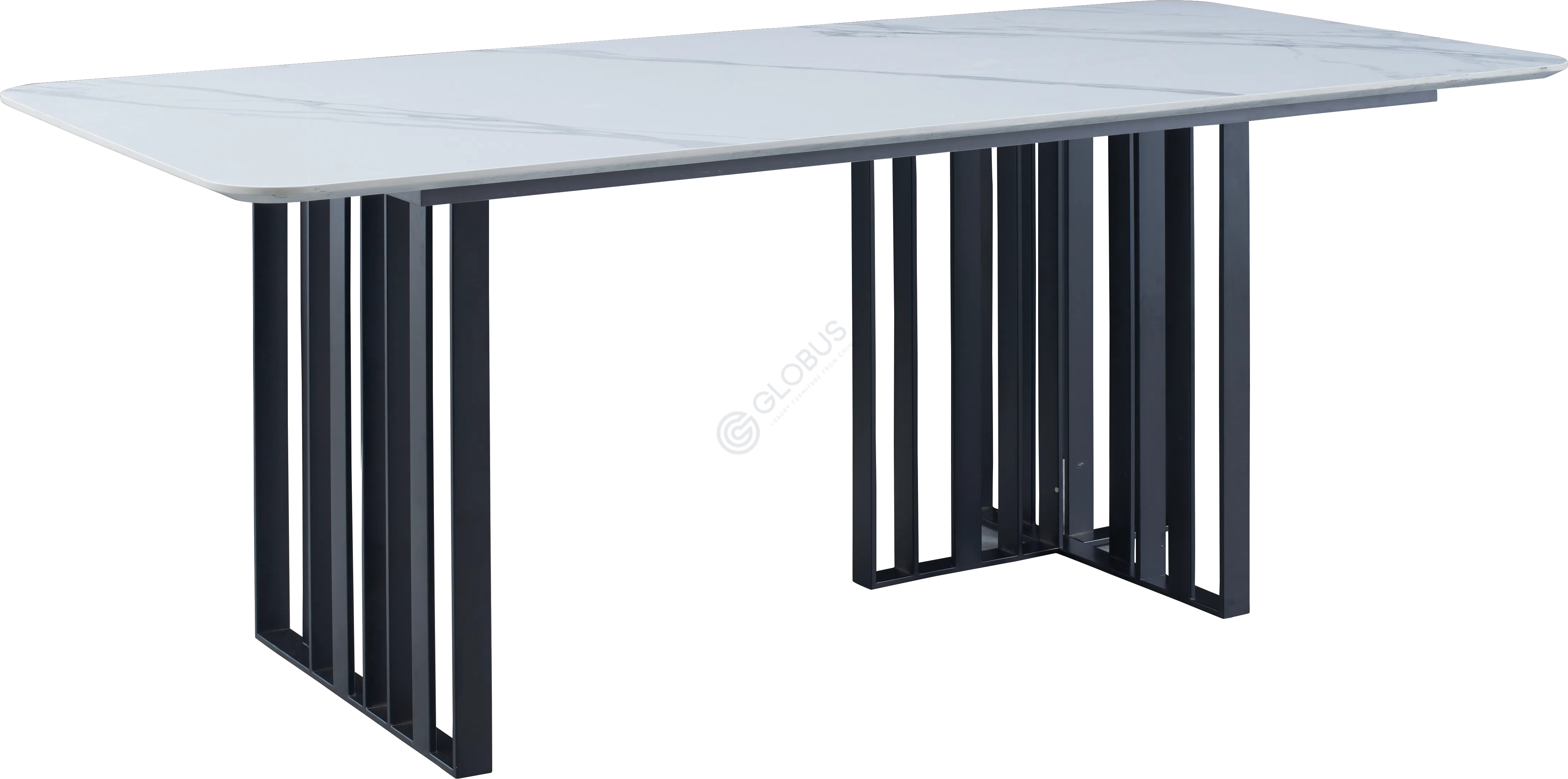 Актуальный стиль стола подчеркивается его минималистичными линиями и сбалансированной композицией. Округлые углы столешницы смягчают строгую геометрию, добавляя изящества и тактильной приятности. Сочетание благородного камня и металлического блеска создает визуальный контраст, который обогащает интерьер, не перегружая его. Это изделие воплощает собой идею функциональной эстетики, где каждая деталь служит общей концепции безупречного вкуса.