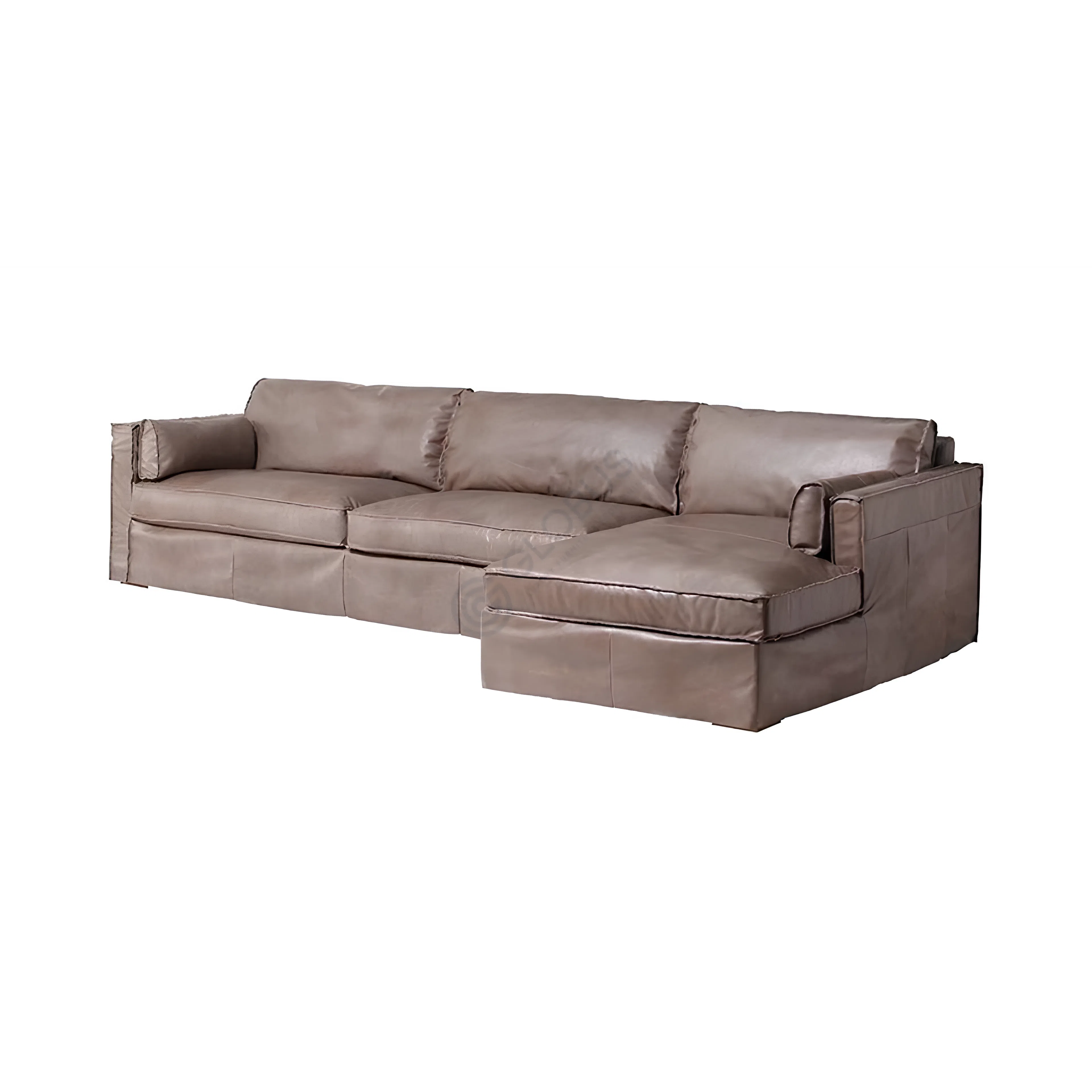 Современный диван из вощёной кожи с тёплым коньячным оттенком задаёт спокойный ритм гостиной. Прямые подлокотники, объёмные подушки сиденья и спинки и аккуратная строчка формируют чистый силуэт, который выглядит солидно и ненавязчиво. Низ закрыт тщательно скроенной кожаной юбкой до пола, благодаря чему модель смотрится цельно и опрятно.