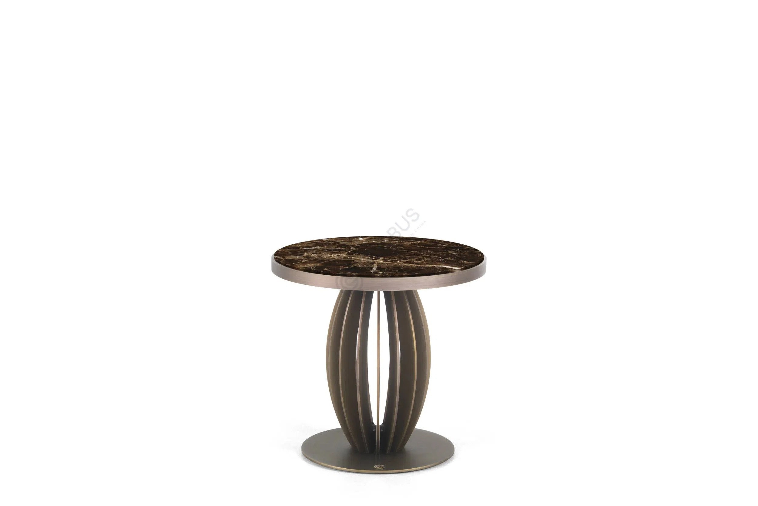 Округлая столешница из зеркального стекла подчеркивает чистоту форм и создает эффект легкости, отражая свет и расширяя пространство. Под ней медная опора в виде изящных вертикальных пластин соединяется с круглым основанием, придавая композиции архитектурную выразительность.