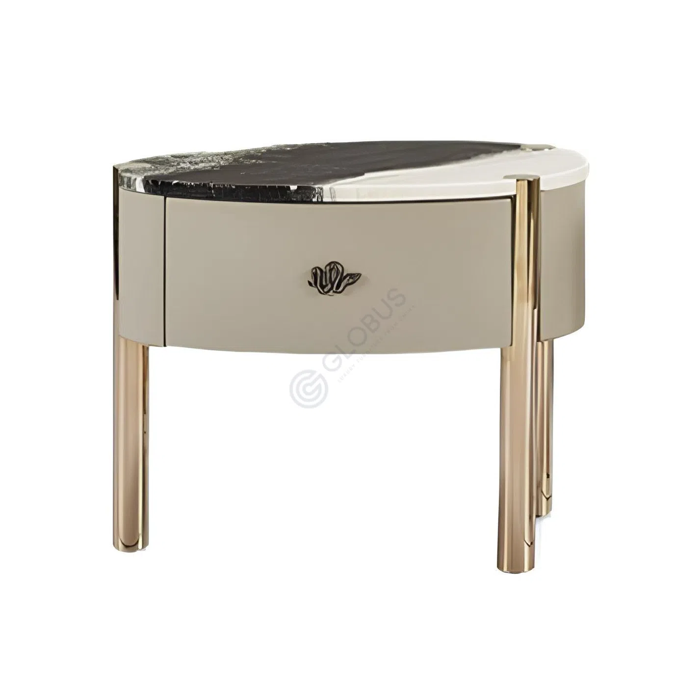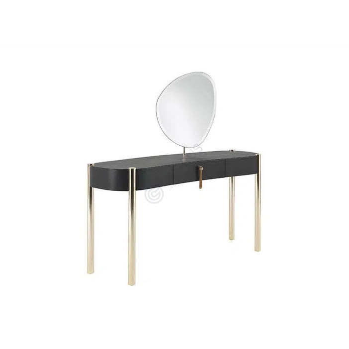 Верхняя часть выполнена из натурального мрамора глубокого черного оттенка. Его поверхность, испещренная едва заметными прожилками, таит в себе природную красоту и придает изделию особое благородство. Каркас и основание изготовлены из полированной нержавеющей стали, искусно отделанной под золото. Зеркальный блеск этого металла подчеркивает эксклюзивность и визуальную легкость конструкции.