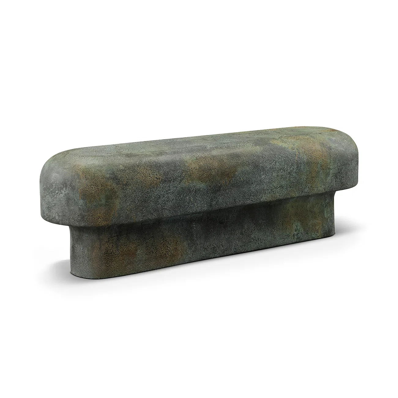 В основе — натуральное дерево для прочности и стабильности. Внешняя поверхность выполнена из металла с глубокой патиной, напоминающей темную бронзу; слегка зернистая фактура приятно ощущается и визуально смягчает массив.
