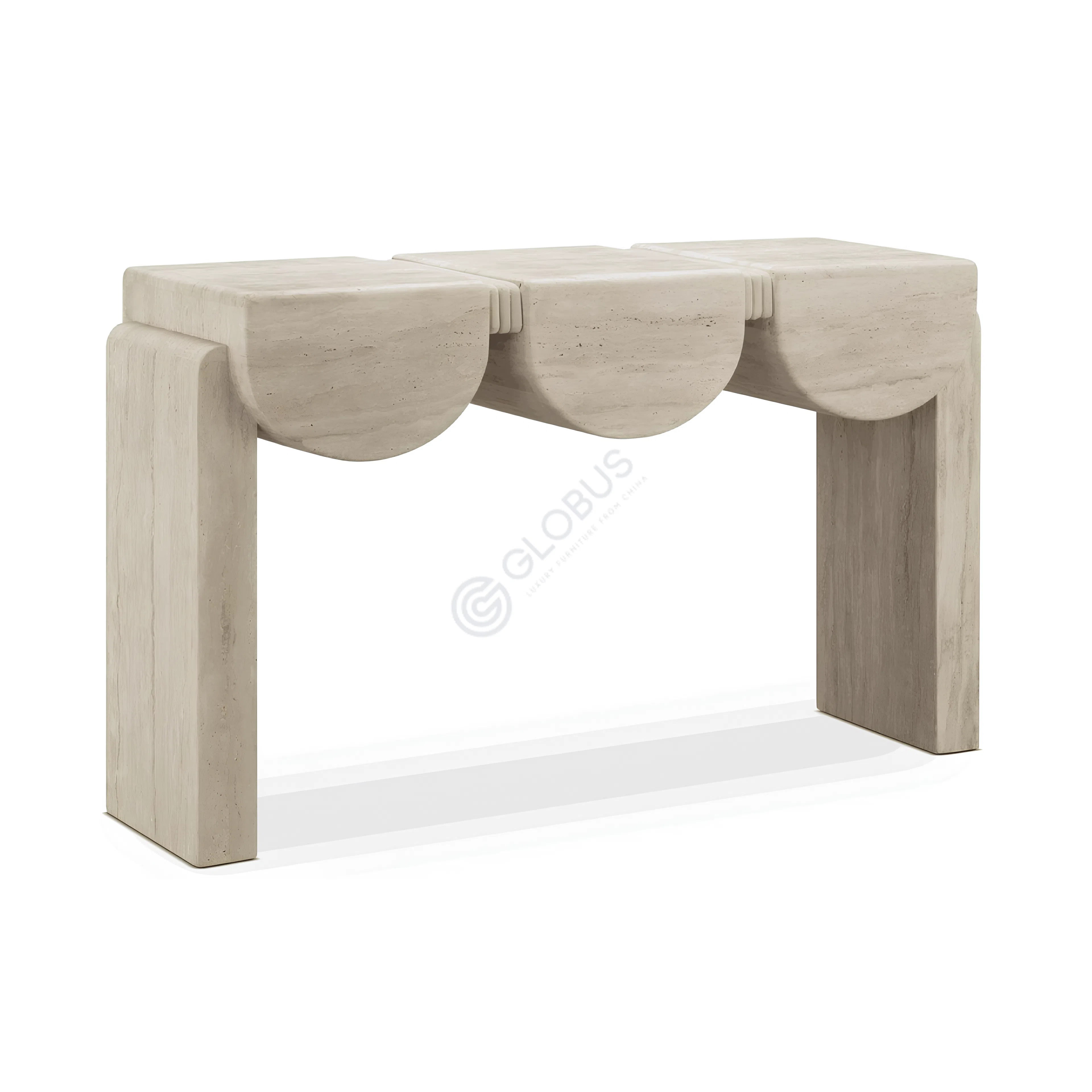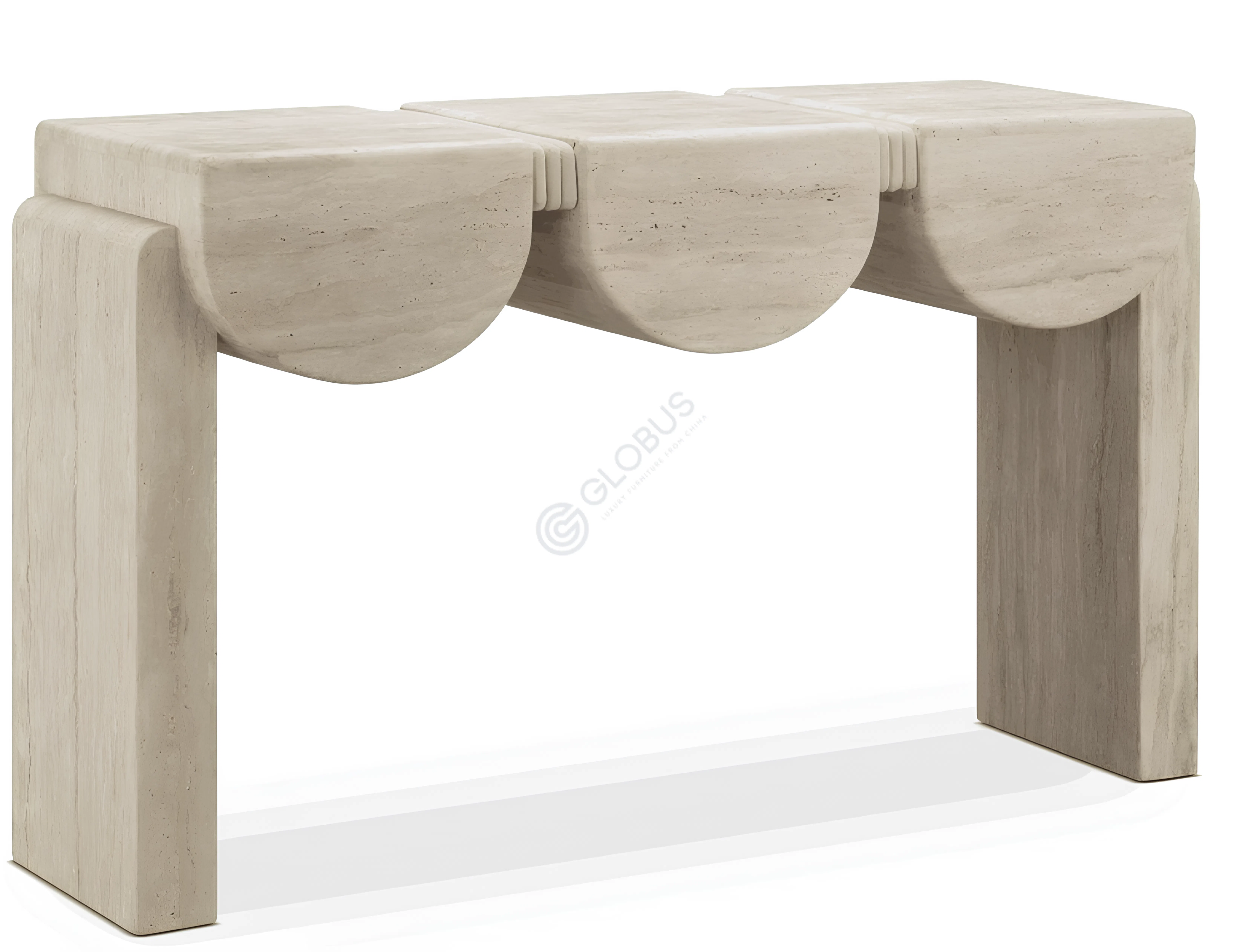 Низкий журнальный столик из травертина с плавными полуовальными контурами и аккуратным центральным акцентом. Теплый светло-бежевый оттенок и естественные прожилки камня придают поверхности благородную глубину, а закругленные кромки делают силуэт мягким и выразительным.