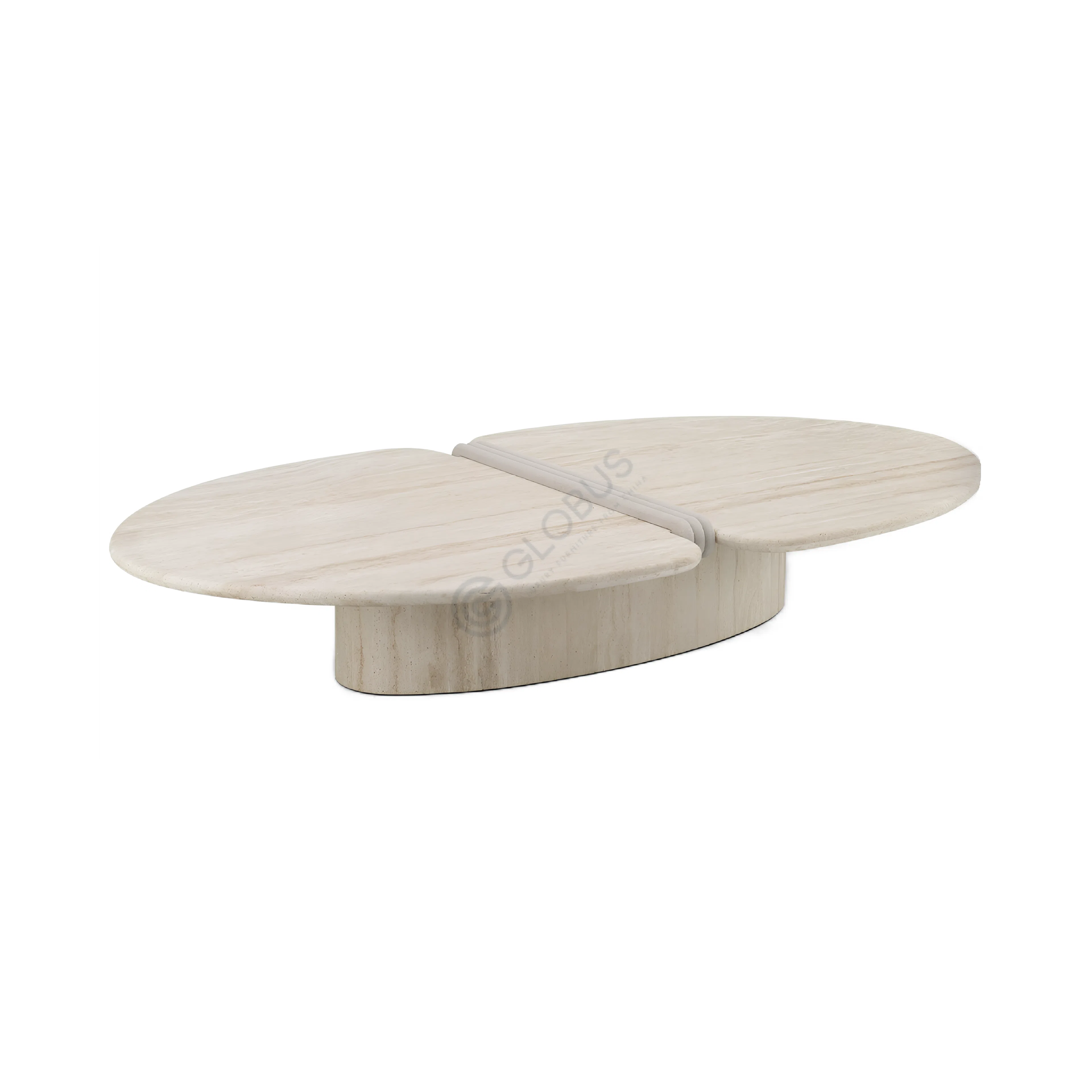 Скульптурная консоль из травертина с матовой шлифовкой и выразительной природной пористостью. Светло‑бежевый тон подчеркивает объемы, а три полукруглых модуля под столешницей создают спокойный архитектурный ритм. Плавно скругленные кромки и монолитные опоры придают образу современную чистоту.