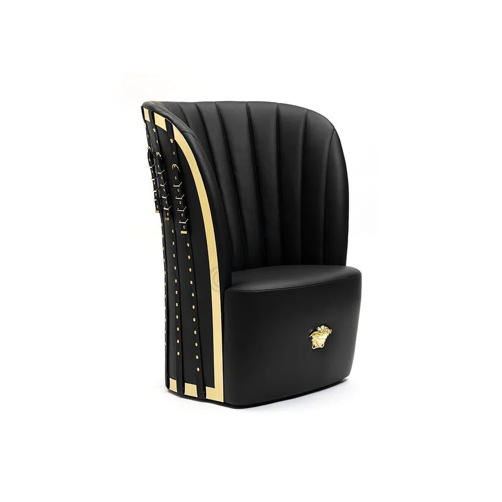 Элегантность и смелый характер объединяются в этом кресле, предназначенном для современной гостиной. Его белоснежная текстильная обивка создает эффектную основу для графических черных ремней, которые искусно обвивают изогнутые подлокотники. Золотая эмблема, расположенная на одном из подлокотников, выступает выразительным акцентом, подчеркивая эксклюзивность и внимание к деталям.