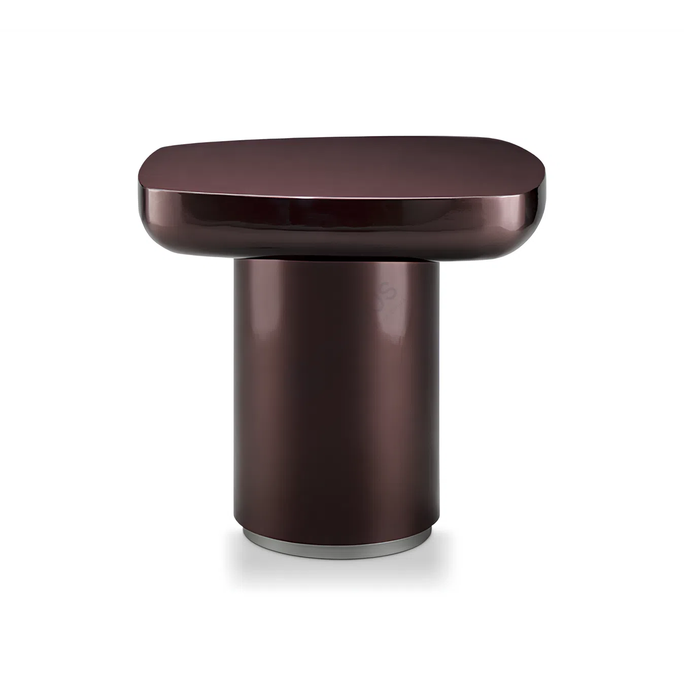 Журнальный столик с плавной геометрией и низким пьедесталом привносит в гостиную современную эстетику. Асимметричная форма со скругленными углами, подчеркнутая насыщенным бирюзово‑зеленым оттенком, визуально облегчает объем, а круглая стальная деталь в центре добавляет графичности и глубины.