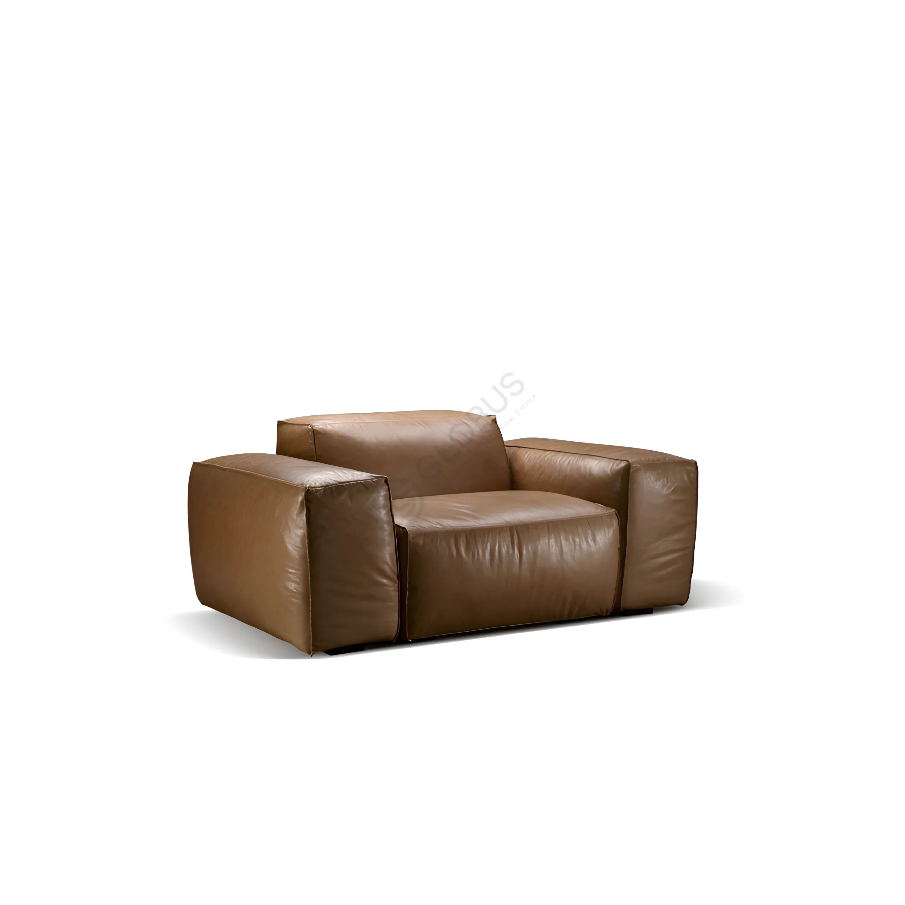Лаконичный модульный диван в современном стиле с L‑образной композицией и глубокими посадочными зонами. Низкий профиль, объемные секции и мягкие скругления подчеркивают графичность силуэта, а теплый оттенок коньяка делает образ уютным и спокойным.
