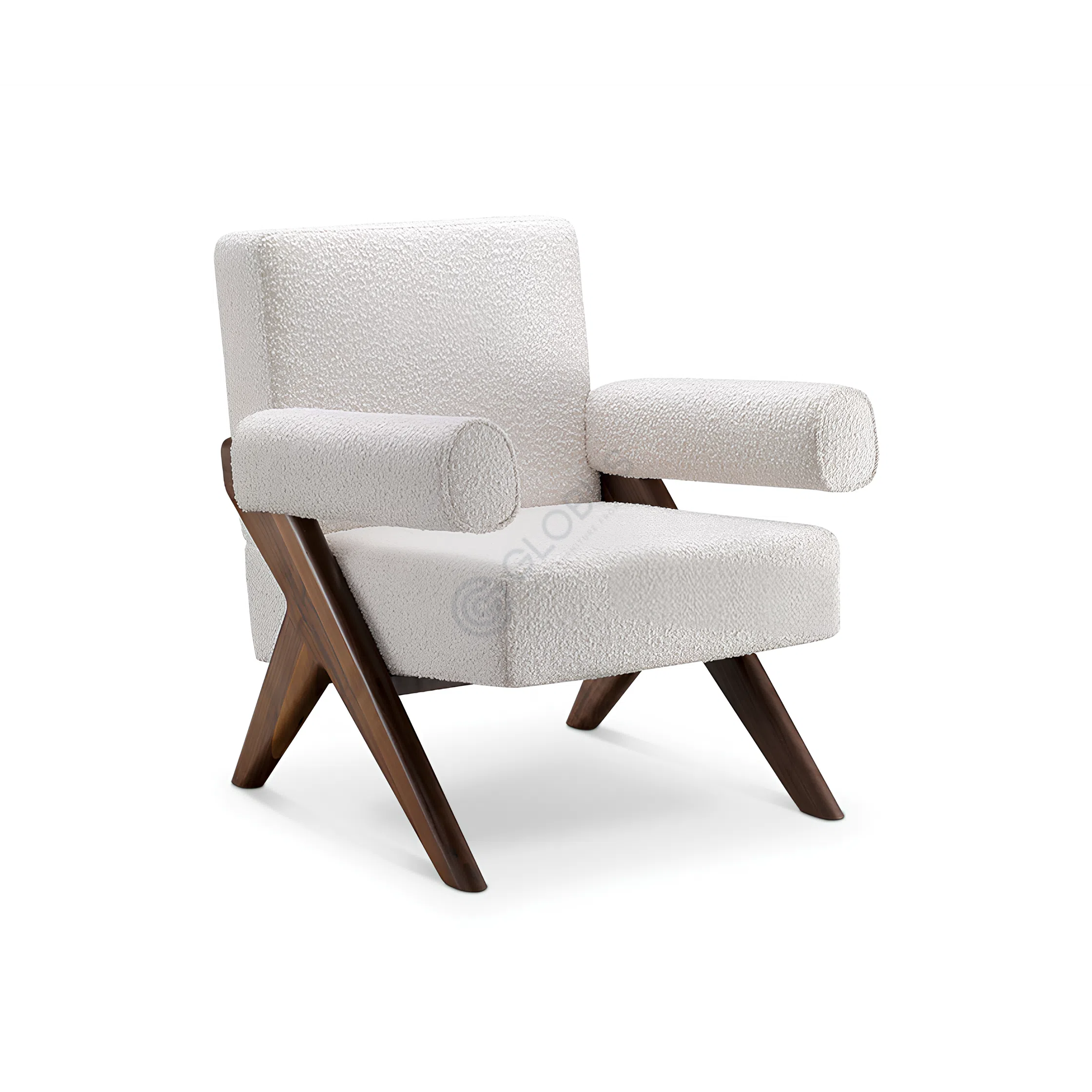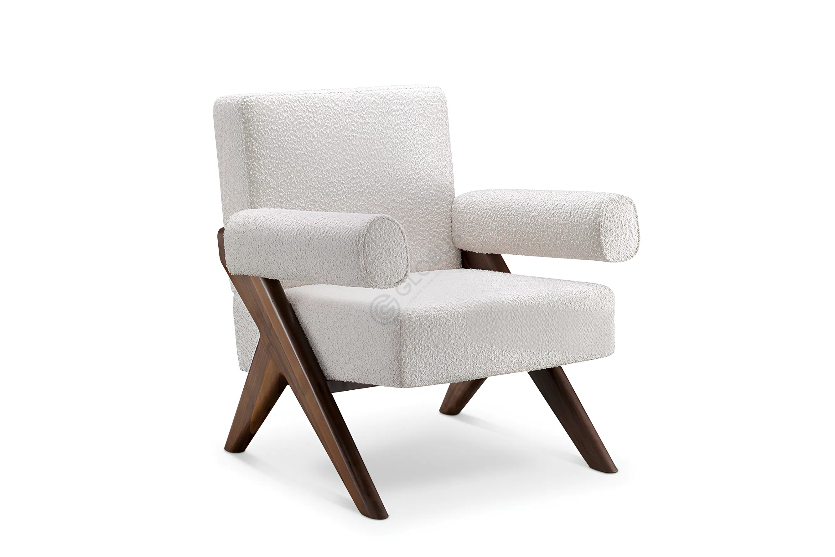 Основательность конструкции придает прочная рама из натурального дерева. Выразительные геометрические формы опор и подлокотников подчеркивают современный характер предмета, демонстрируя искусное исполнение. Мягкие элементы сиденья и спинки обиты высококачественной кожей. Ее тактильная приятность и благородный матовый блеск идеально дополняют древесные оттенки.