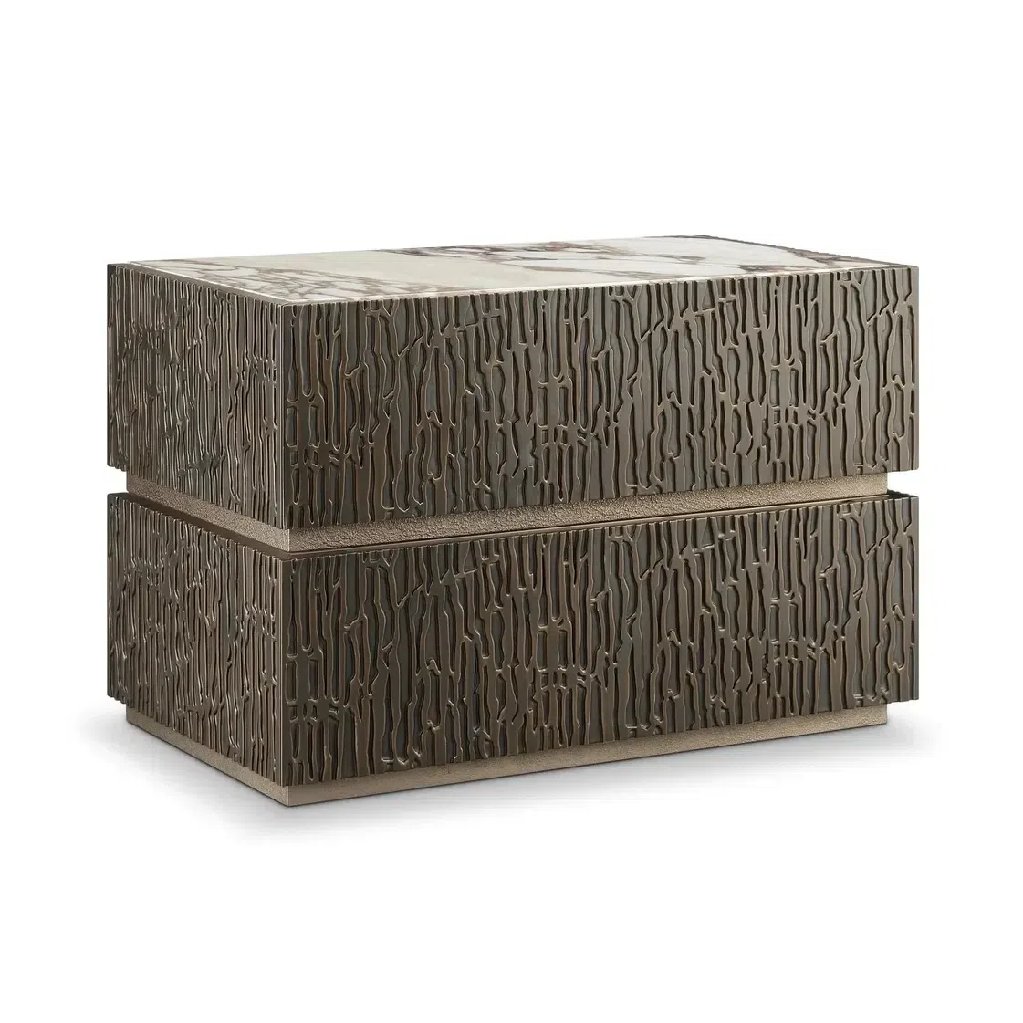 Верхняя панель изделия выполнена из натурального мрамора, чья неповторимая прожилковая структура придает ему индивидуальный шарм и ощущение роскоши. Каждый элемент тщательно проработан: корпус из высококачественной фанеры и МДФ обеспечивает прочность и долговечность, а фасады ящиков украшает глубокий рельефный узор, имитирующий природные мотивы. Этот текстурный рисунок, выполненный с особой детализацией, создает интересную игру света и тени, делая поверхность живой и динамичной.