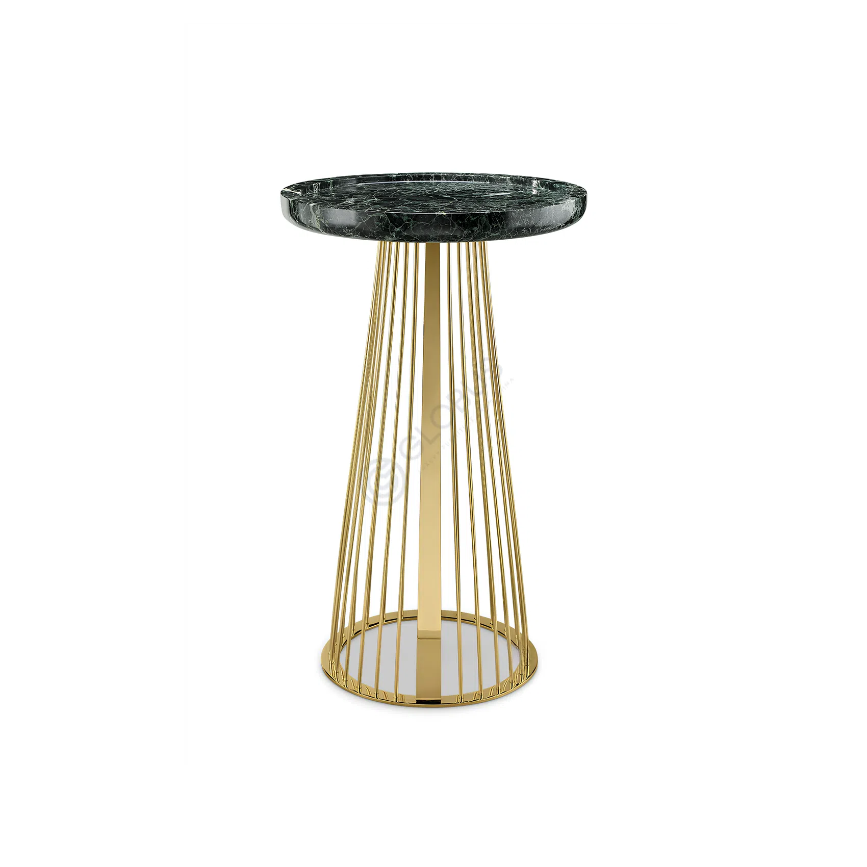 Сиденье, обитое высококачественной кожей, отличается приятной на ощупь фактурой, даря исключительный комфорт. Основание, выполненное из полированной нержавеющей стали с золотистым покрытием, имеет уникальную структуру из вертикальных стержней, которые придают ему воздушность и легкость. Внутренняя конструкция из прочной фанеры обеспечивает долговечность и стабильность.