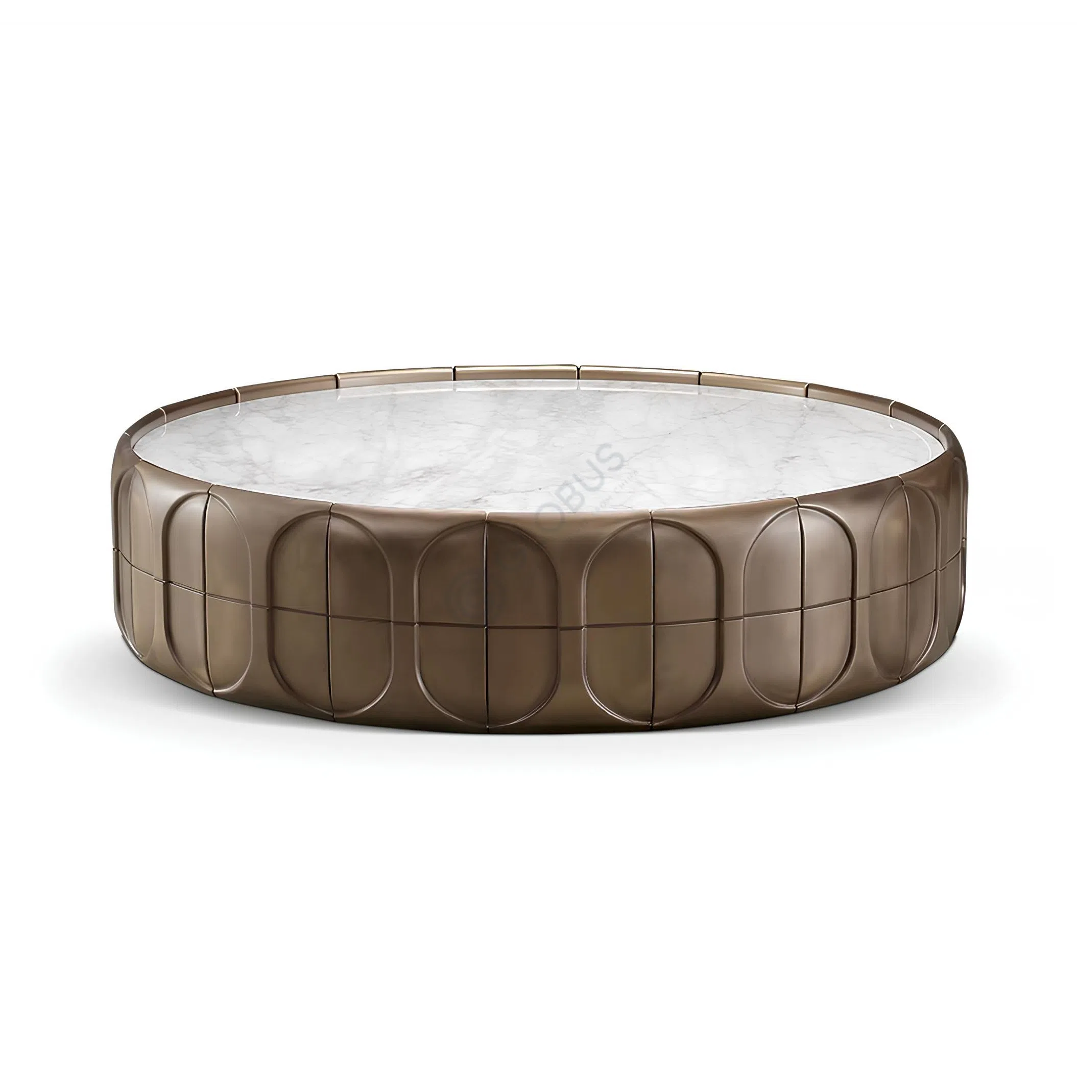 Верхняя часть, выполненная из натурального мрамора, привлекает взгляды своим неповторимым рисунком прожилок, что делает каждый предмет поистине эксклюзивным. Основание столика, мастерски изготовленное из МДФ, облачено в изысканную отделку теплого металлического оттенка, которая подчеркивает его объемную форму и создает чарующую игру света на фигурных элементах.