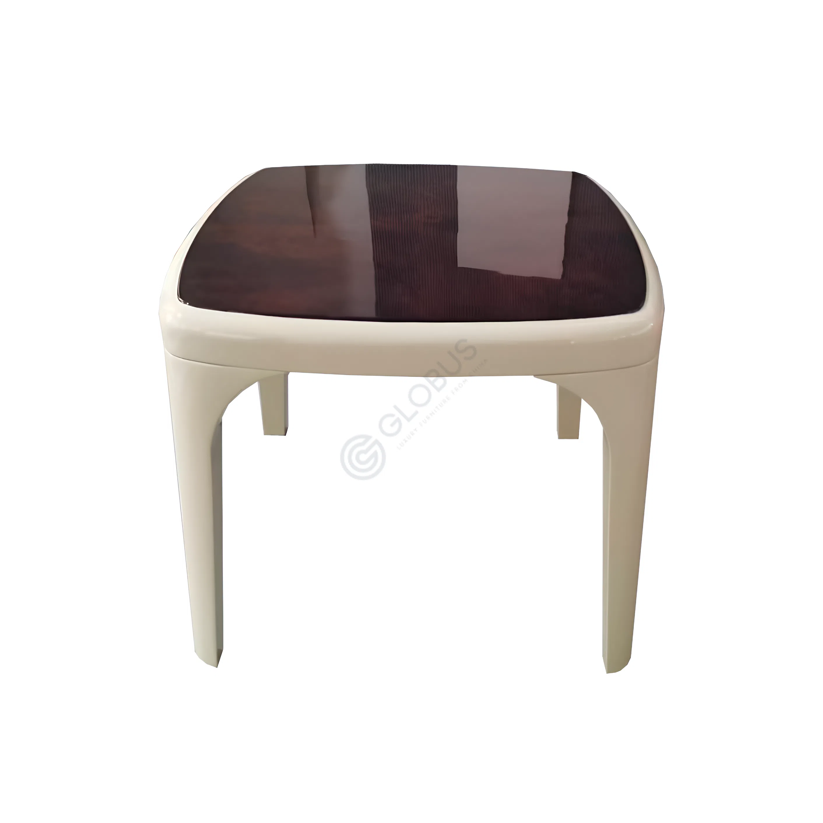 Верхняя плоскость изделия выполнена из натурального шпона, демонстрирующего роскошный, глубокий оттенок красного дерева с выразительным рисунком древесных волокон. Глянцевая отделка поверхности придает ей зеркальный блеск, подчеркивая уникальную текстуру материала и создавая игру света, которая добавляет окружающему пространству динамики. Основой для этой элегантной отделки служит прочная фанера, обеспечивающая долговечность и стабильность конструкции.