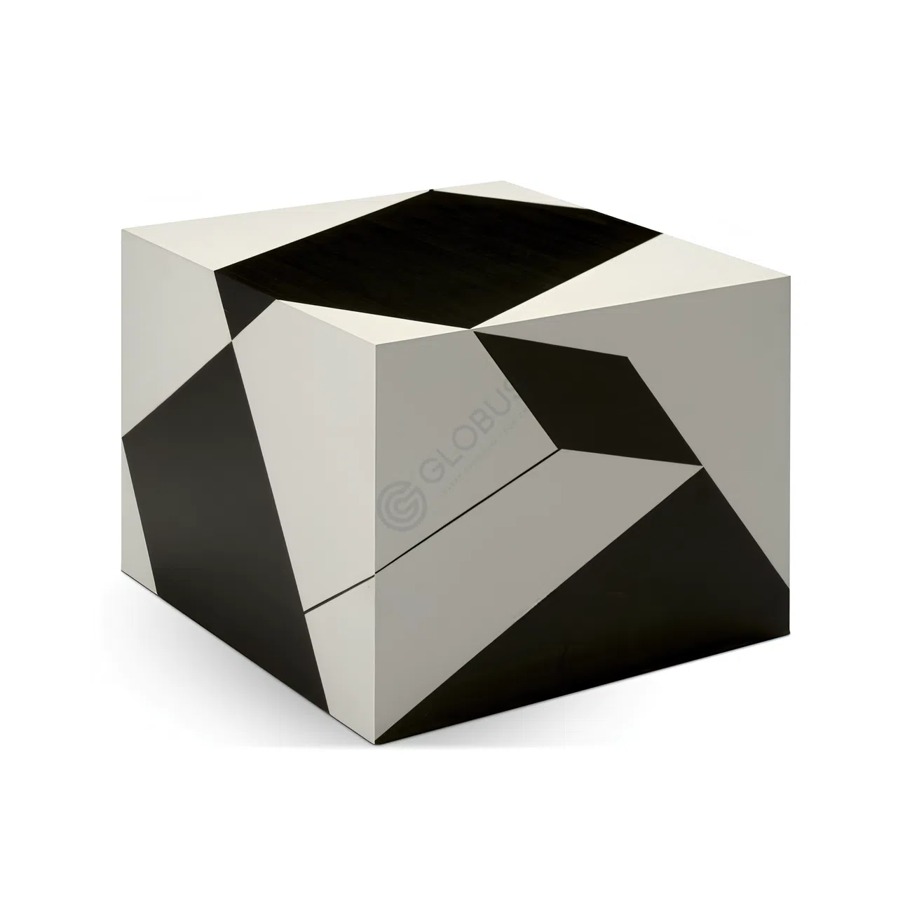 Верхняя панель демонстрирует мастерскую игру контрастов: графичный узор из черных и белых треугольников, расположенных в асимметричной, но гармоничной композиции. Каркас из прочного алюминия гарантирует устойчивость и легкость. Столешница и корпус выполнены с применением натурального дерева, фанеры и изысканного шпона, что придает изделию теплоту и тактильную приятность. Такое соединение разных текстур подчеркивает премиальный класс элемента мебели.