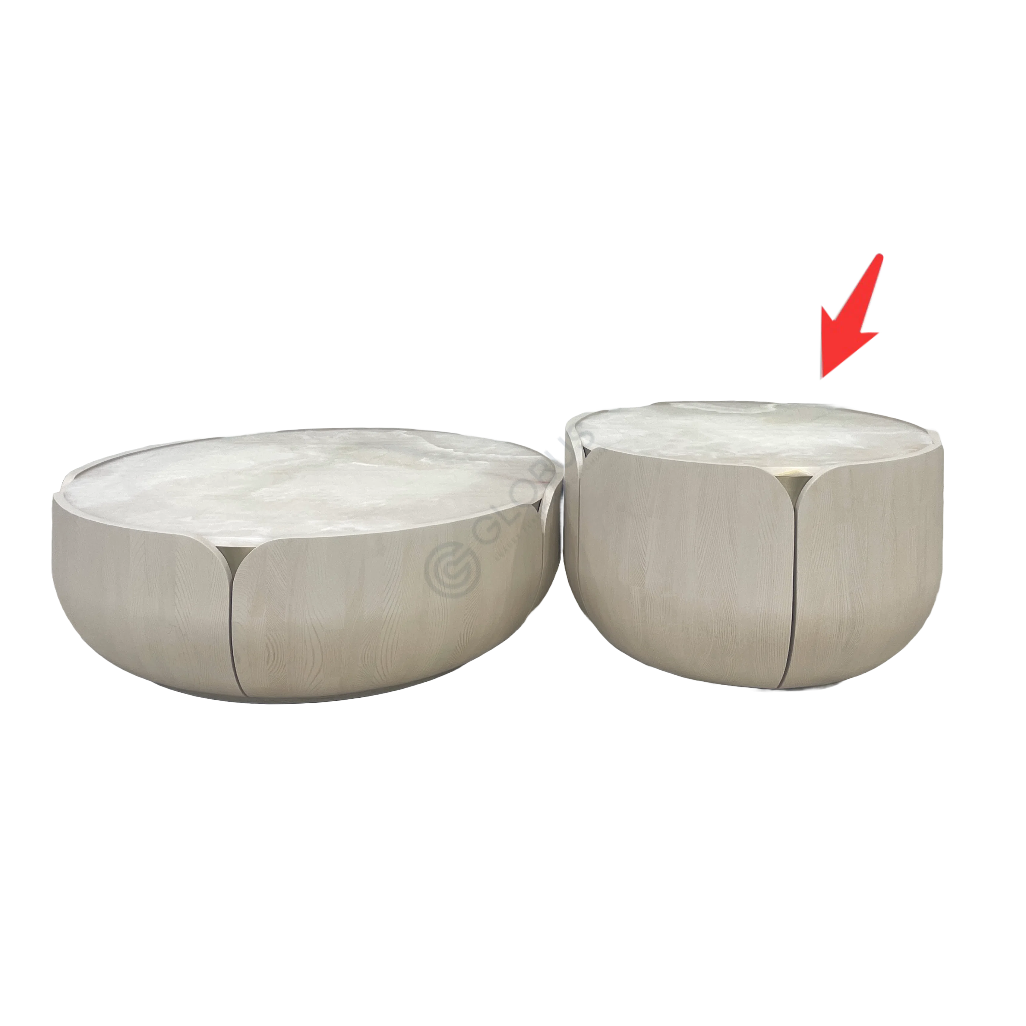 Основание, поддерживающее эту элегантную плоскость, представляет собой скульптурную форму, тщательно выточенную из массива натурального дерева. Богатый, теплый оттенок древесины и ее выразительный рисунок свидетельствуют о подлинном происхождении материала. Форма с мягкими вертикальными изгибами придает дизайну органическую плавность и прочную грацию, смягчая общую массивность конструкции. Гармоничное слияние прохладного, вечного мрамора с живой, фактурной теплотой дерева создает глубокий визуальный и тактильный контраст, возвышая предмет мебели над простой утилитарностью.