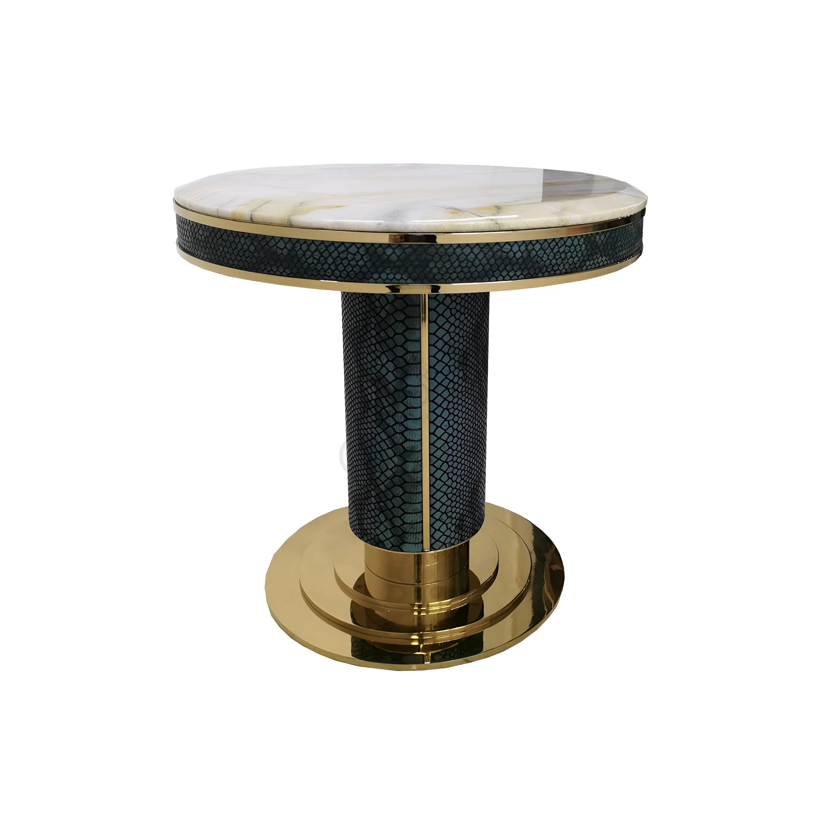Основание столика – это смелое сочетание полированной нержавеющей стали и текстурной экокожи. Золотистые акценты металла эффектно контрастируют с глубоким, богатым узором кожи, придавая конструкции устойчивость и утонченный шик. Каждая деталь тщательно продумана, подчеркивая геометрические формы и изысканность линий.