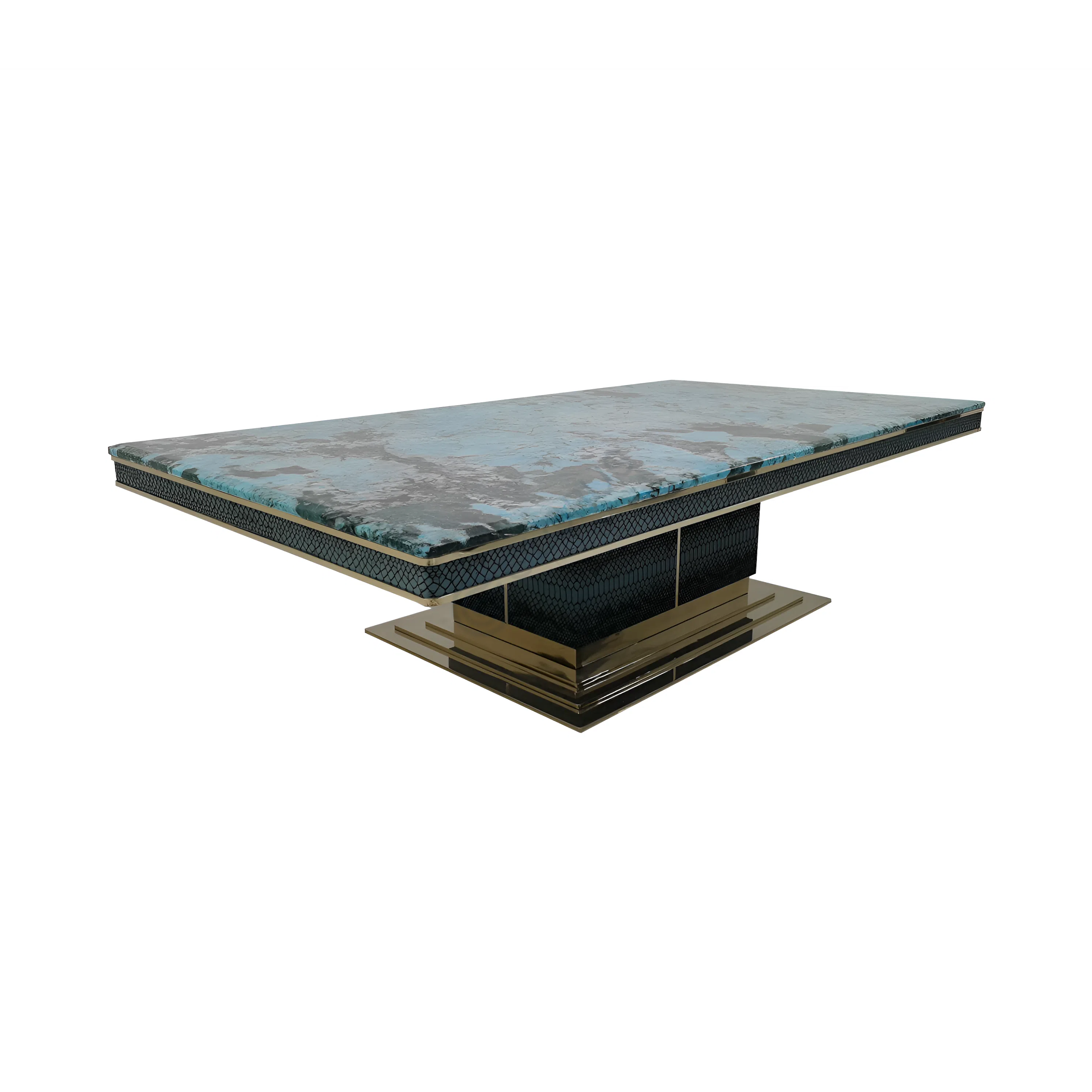 Массивная цилиндрическая опора, обтянутая высококачественной экокожей насыщенного темного оттенка, привносит в композицию смелый, но утонченный акцент. Её фактурная поверхность, имитирующая экзотическую кожу, добавляет интерьеру индивидуальности и тактильного наслаждения. Основание, также выполненное из золотистой нержавеющей стали, обеспечивает превосходную устойчивость и завершает образ своей блестящей поверхностью. Этот столик не просто украшает пространство, он создает в нем атмосферу роскоши и стиля.