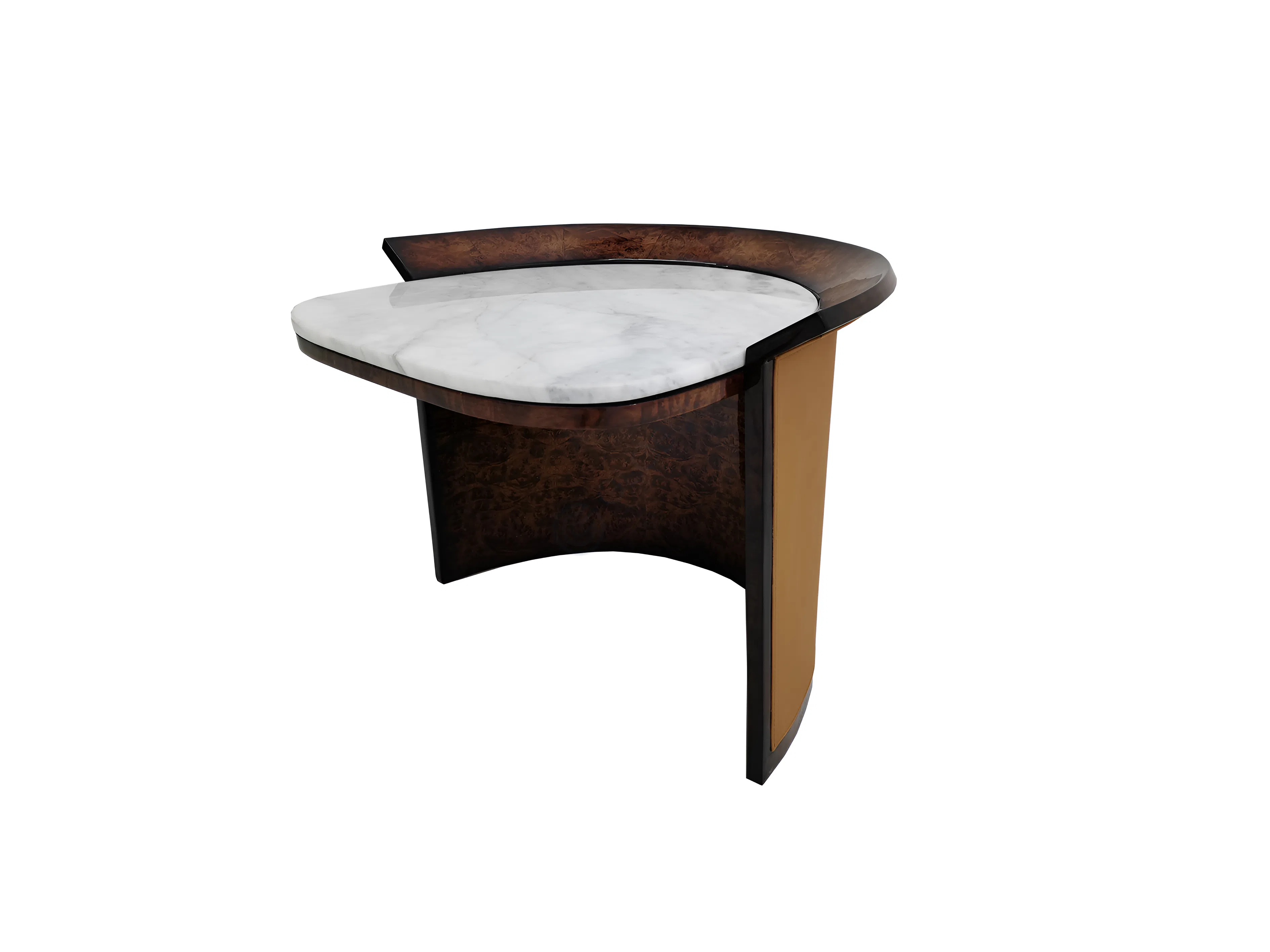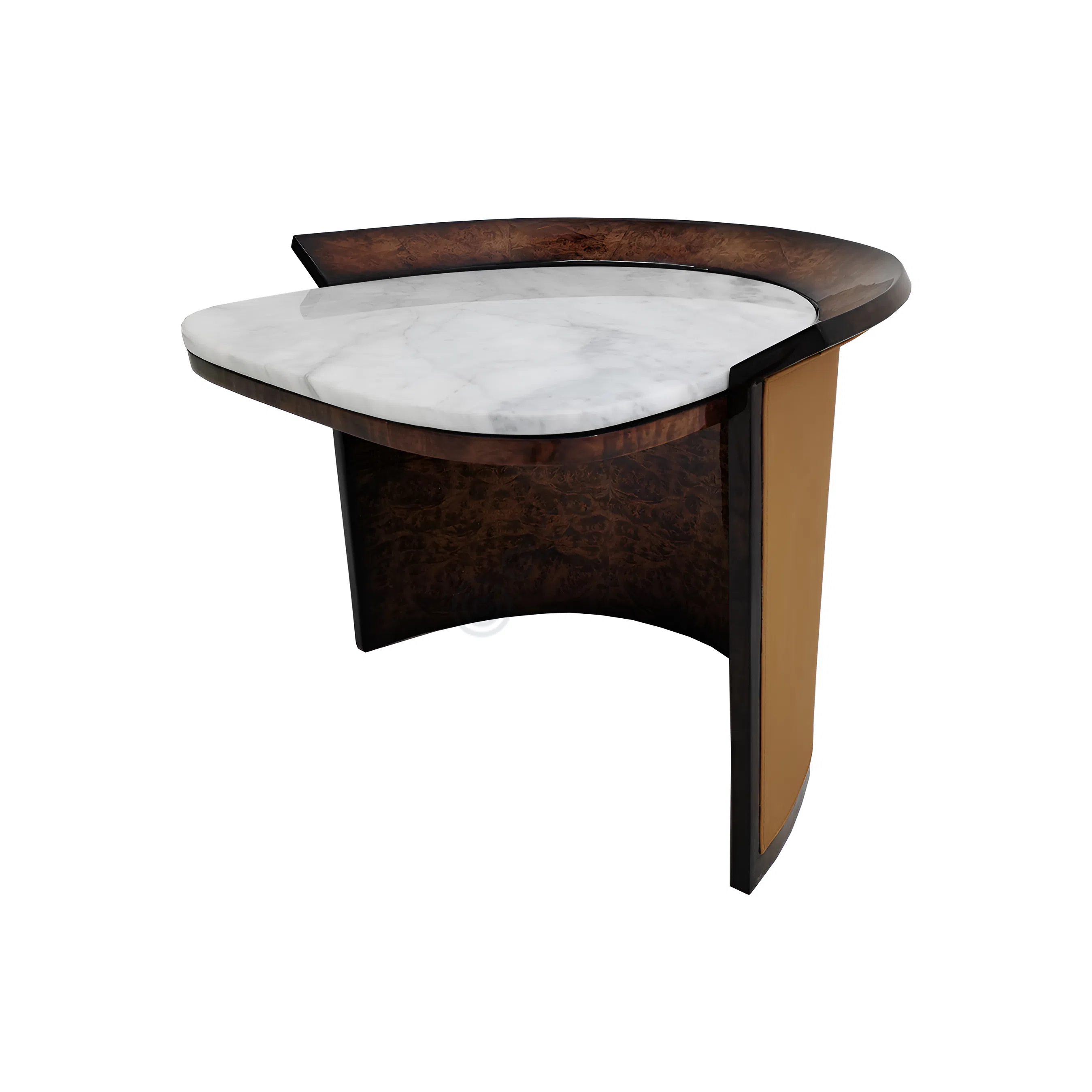 Основу конструкции составляет прочная фанера, обеспечивающая надежность и долговечность изделия. Столешница, изготовленная из высококачественного искусственного мрамора, отличается своей светлой палитрой и утонченным рисунком, создавая элегантную и практичную поверхность. Контрастные акценты создает окантовка из шпона глубокого оттенка, которая подчеркивает изысканные изгибы силуэта.