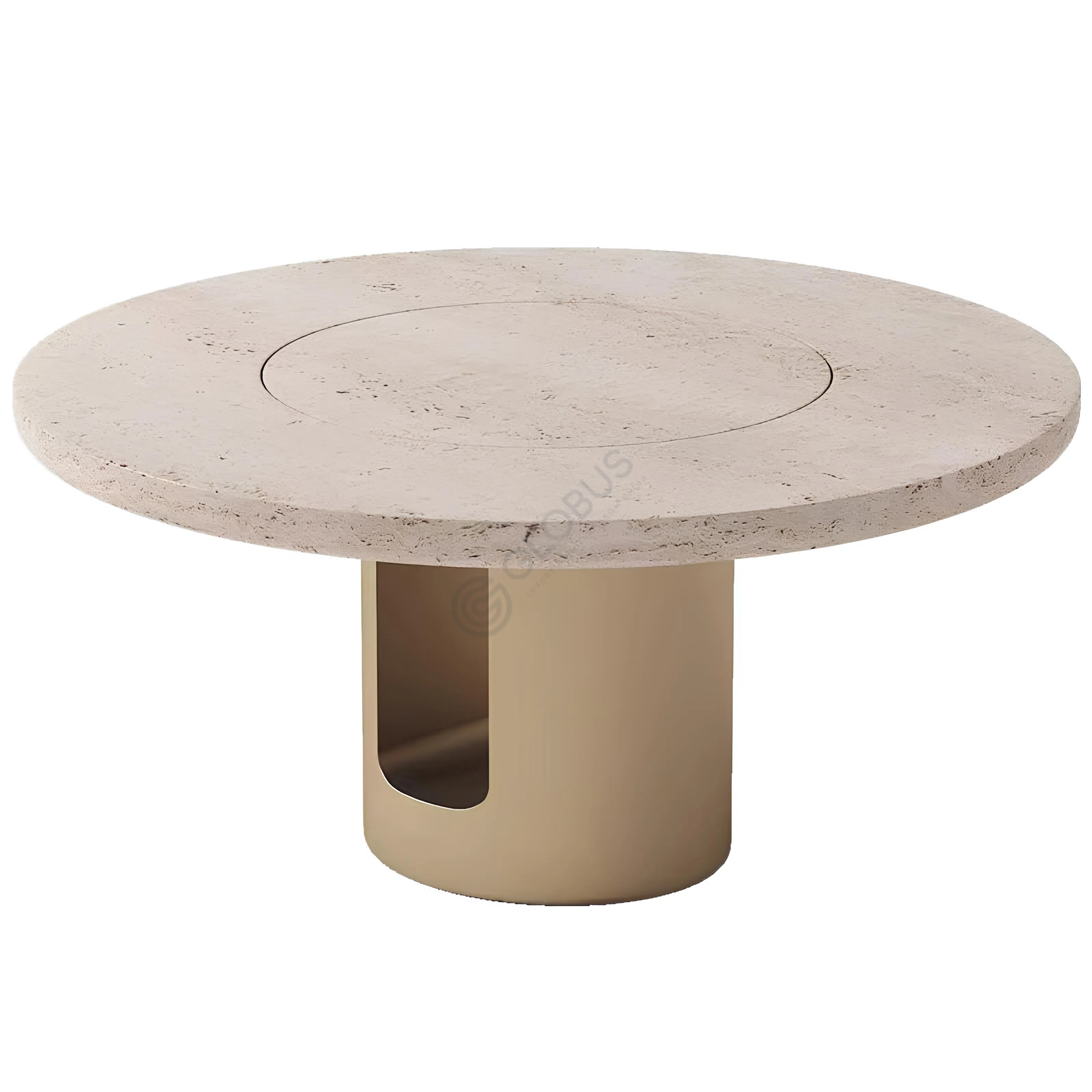 Этот обеденный стол воплощает современную элегантность, представляя собой идеальное сочетание природной красоты и изысканного мастерства. Его выразительная столешница выполнена из натурального травертина, демонстрируя уникальные прожилки и характерную пористую фактуру, которые придают поверхности неповторимую глубину и теплоту. Естественные оттенки камня создают атмосферу умиротворения и подлинности.
