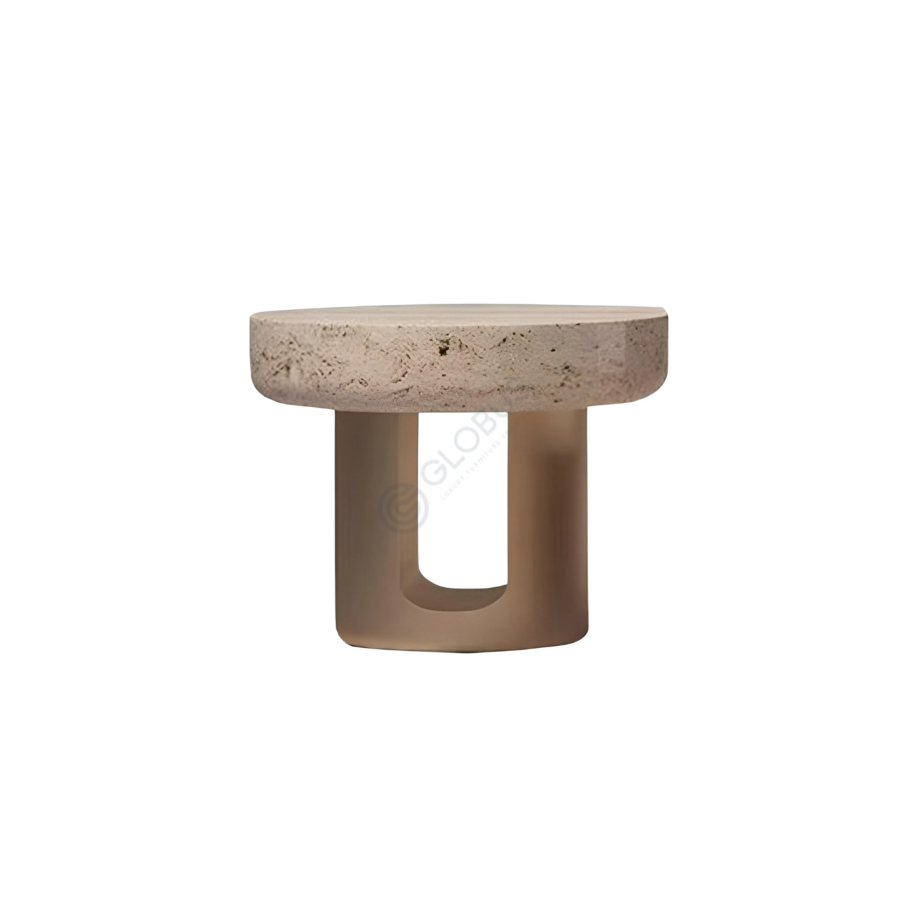 Основание стола, выполненное из прочного металла, придает дизайну отчетливую современную геометрию и устойчивость. Две цилиндрические опоры, окрашенные в благородный теплый оттенок, идеально дополняют светлую палитру камня. Привлекательные фигурные вырезы в каждой ножке не только визуально облегчают массивную конструкцию, но и служат эффектным акцентом, привнося в общий облик характерную архитектурную продуманность.