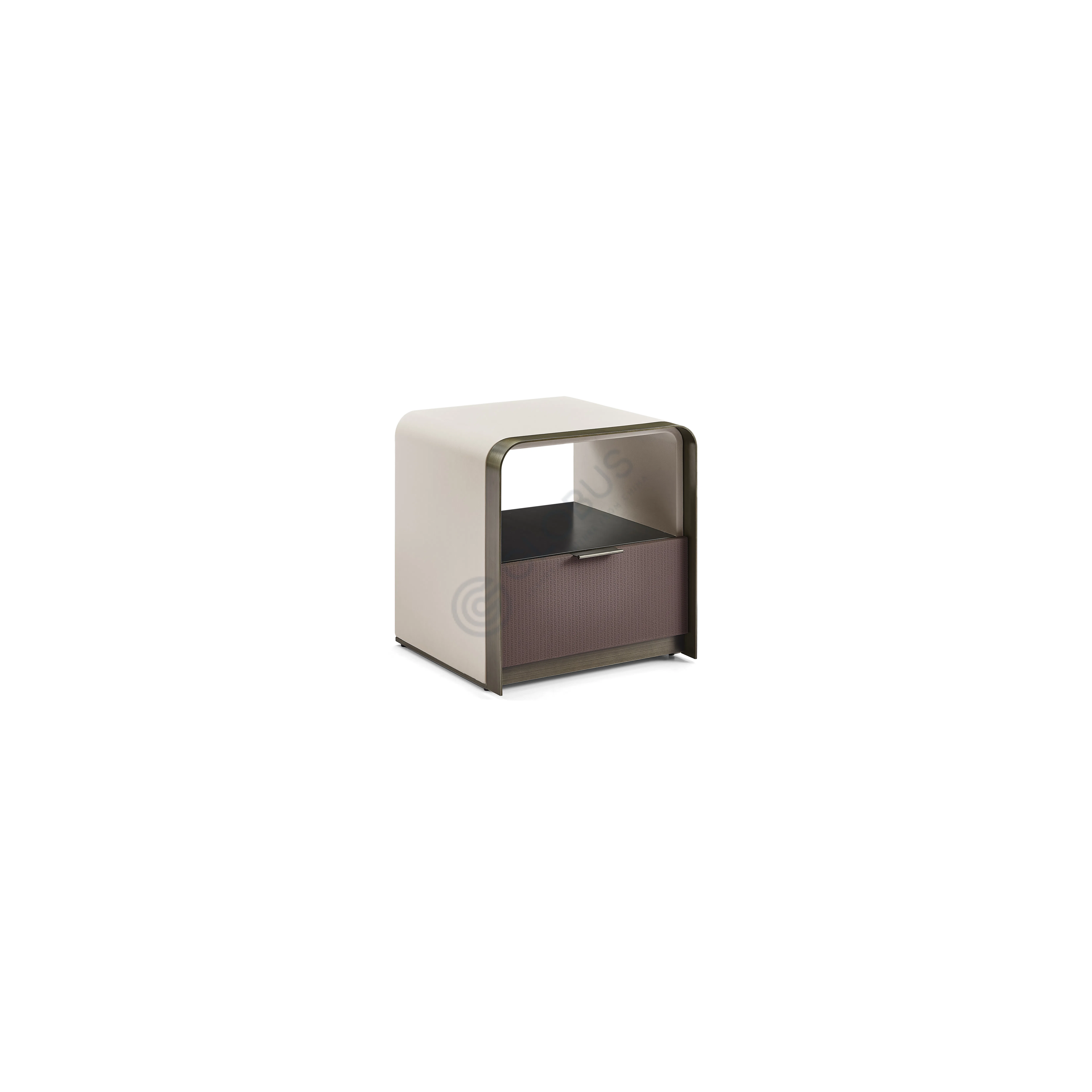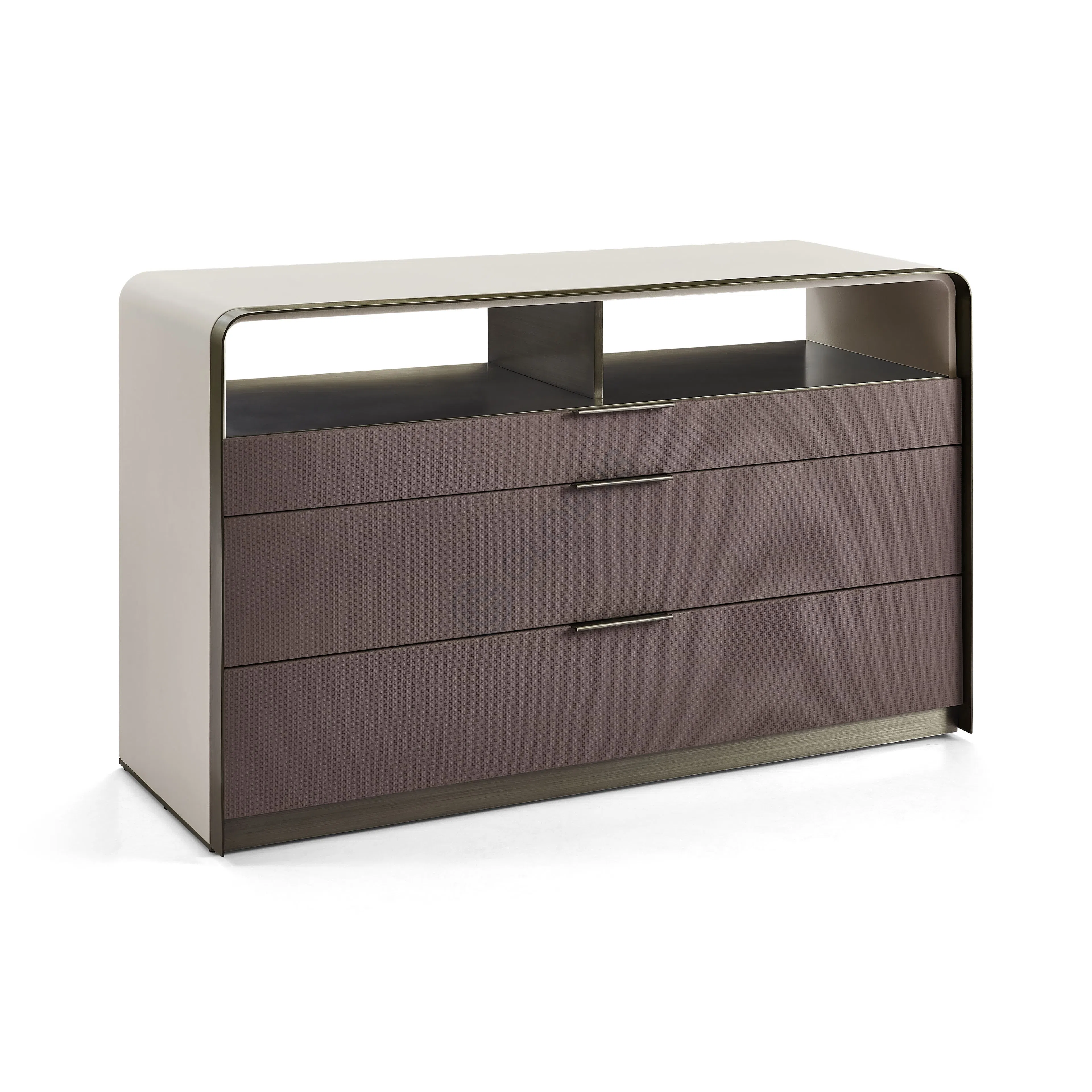 Основу конструкции составляет прочная фанера, элегантно облицованная высококачественной экокожей на микрофибре, которая дарит приятные тактильные ощущения и визуальную глубину благодаря своей деликатной текстуре. Деликатный блеск нержавеющей стали, выполненной в теплом золотистом оттенке, подчеркивает изысканные контуры, создает гармоничный контраст и придает изделию величественный характер. Каждая из трех вместительных выдвижных секций оснащена изящными ручками, которые завершают образ.