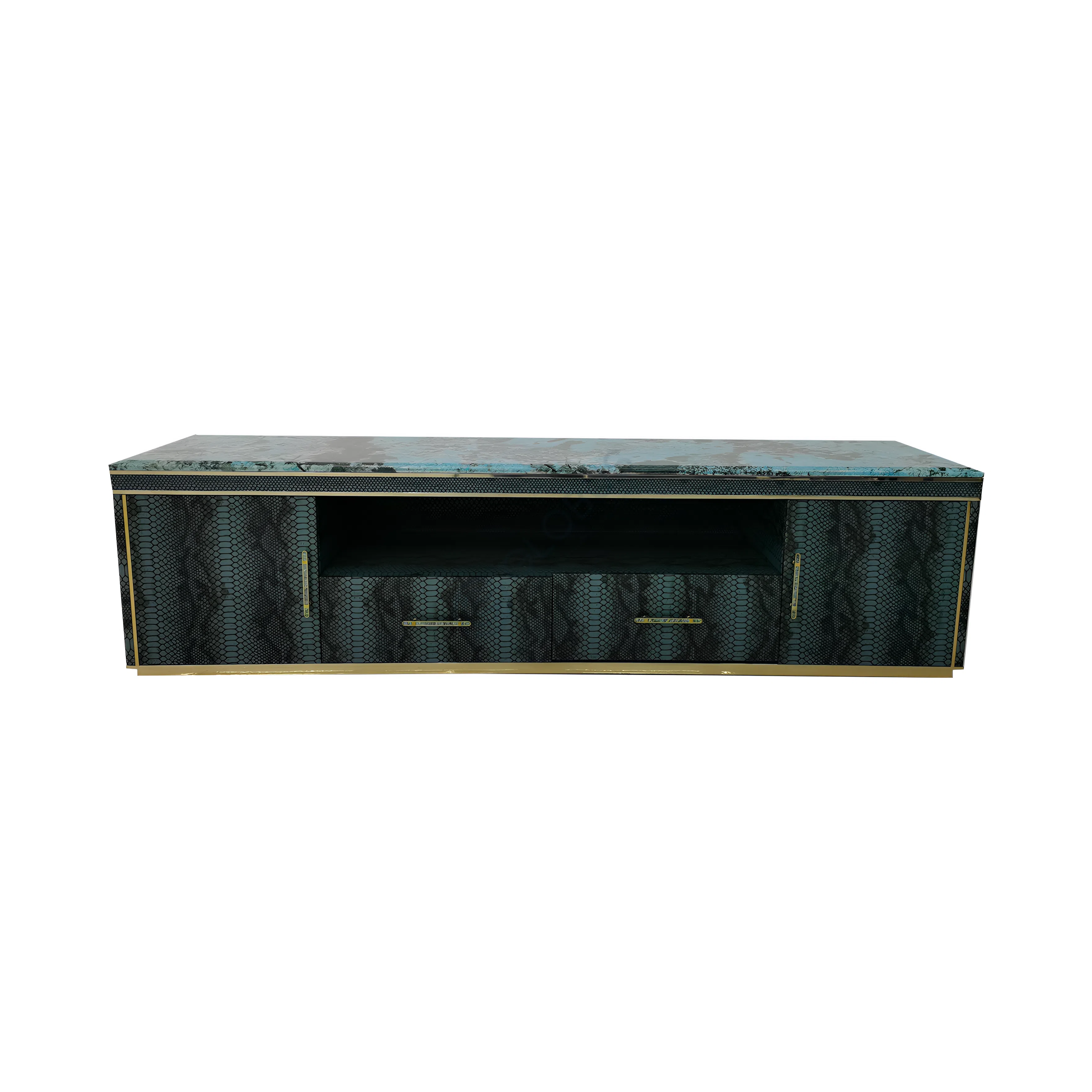 Верхняя часть буфета увенчана столешницей из натурального мрамора. Уникальный узор этого камня, сочетающий в себе оттенки лазури, изумруда и графита, придает изделию неповторимый характер, напоминая абстрактную карту или вид на океан с высоты. Сочетание прочной фанерной основы с такими роскошными материалами, как мрамор, кожа и сталь, демонстрирует безупречное качество и внимание к деталям.