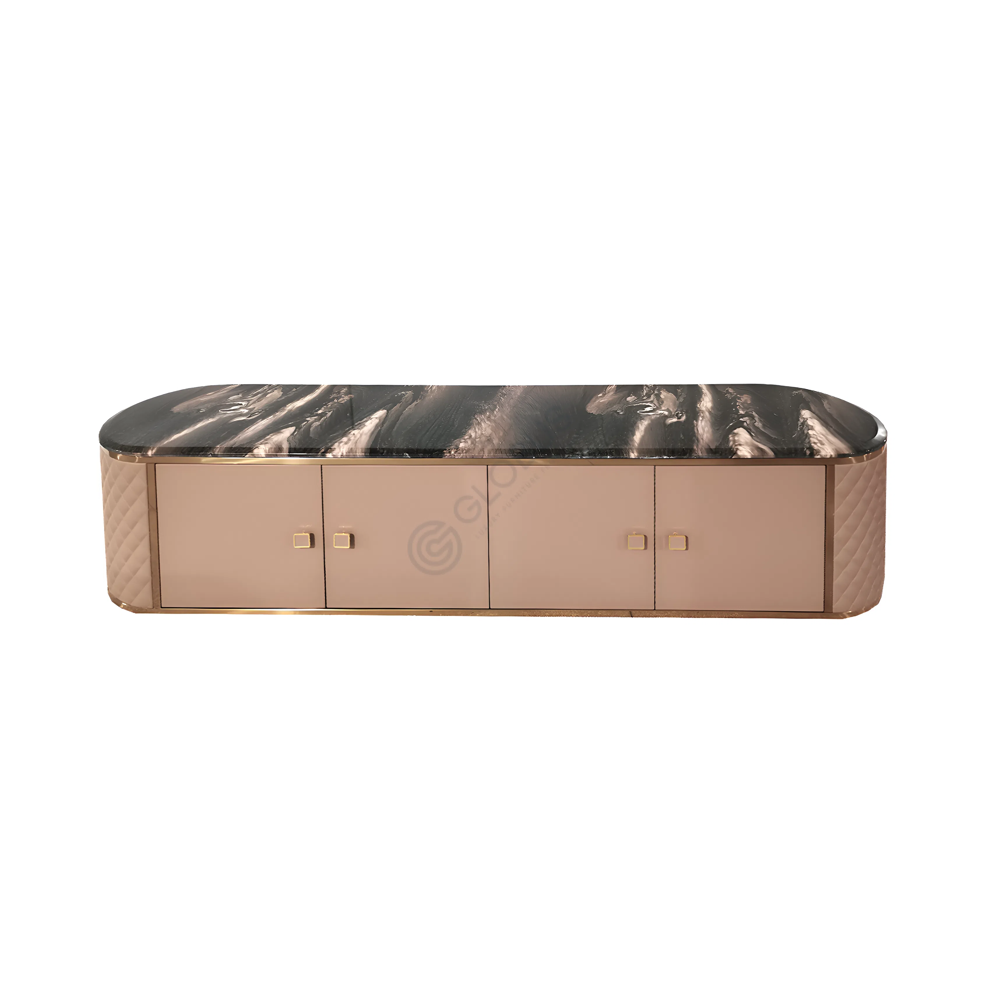 Верхняя столешница, выполненная из искусственного мрамора, демонстрирует деликатные прожилки, придающие предмету благородный и роскошный вид, при этом оставаясь практичной в уходе. Изящная окантовка из полированной нержавеющей стали золотистого оттенка тонко подчеркивает округлые линии силуэта, добавляя изделию сияющий штрих.