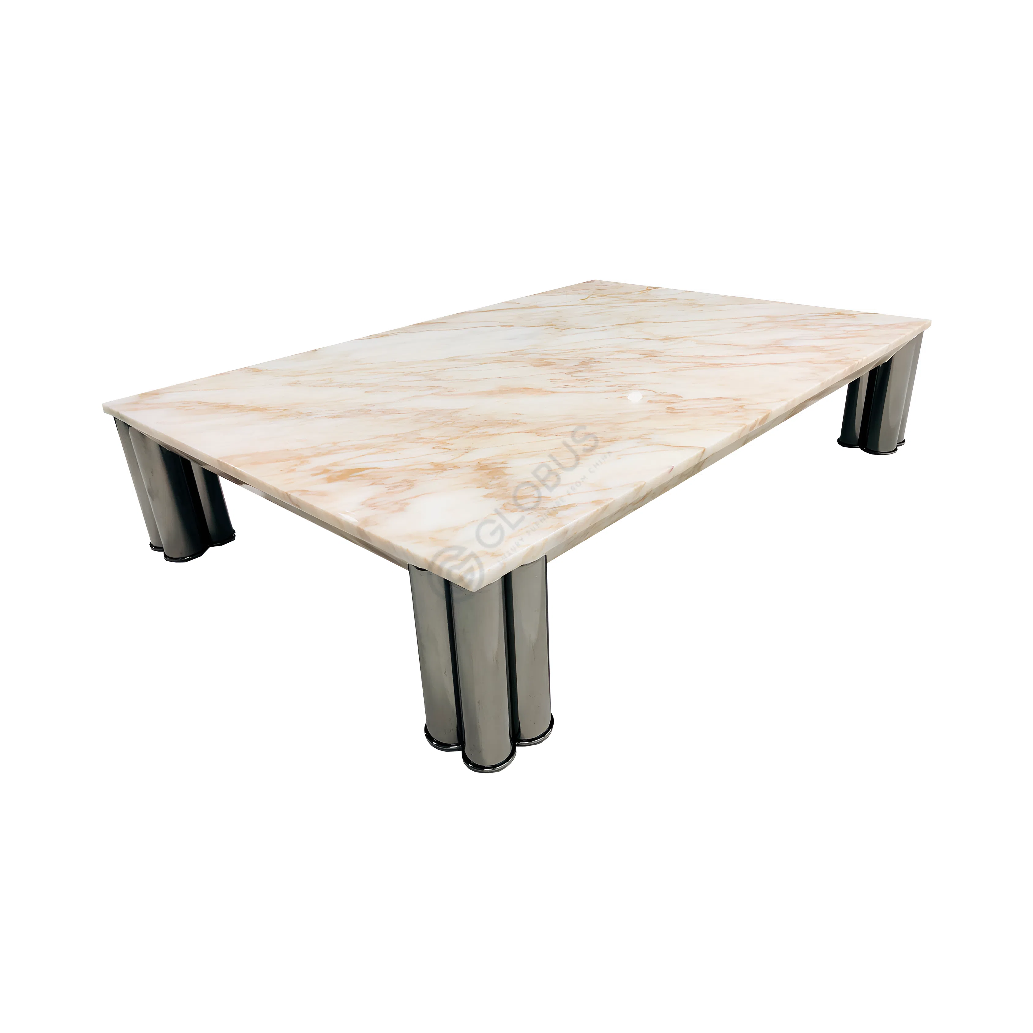 Основание стола представляет собой массивную центральную опору из нержавеющей стали, искусно сформированную из группы вертикальных цилиндров. Их сатиновый, почти бронзовый оттенок великолепно гармонирует с мраморным рисунком, добавляя дизайну глубину и благородство. Тяжелое круглое основание обеспечивает исключительную устойчивость, в то время как общая конструкция подчеркивает современный характер изделия.
