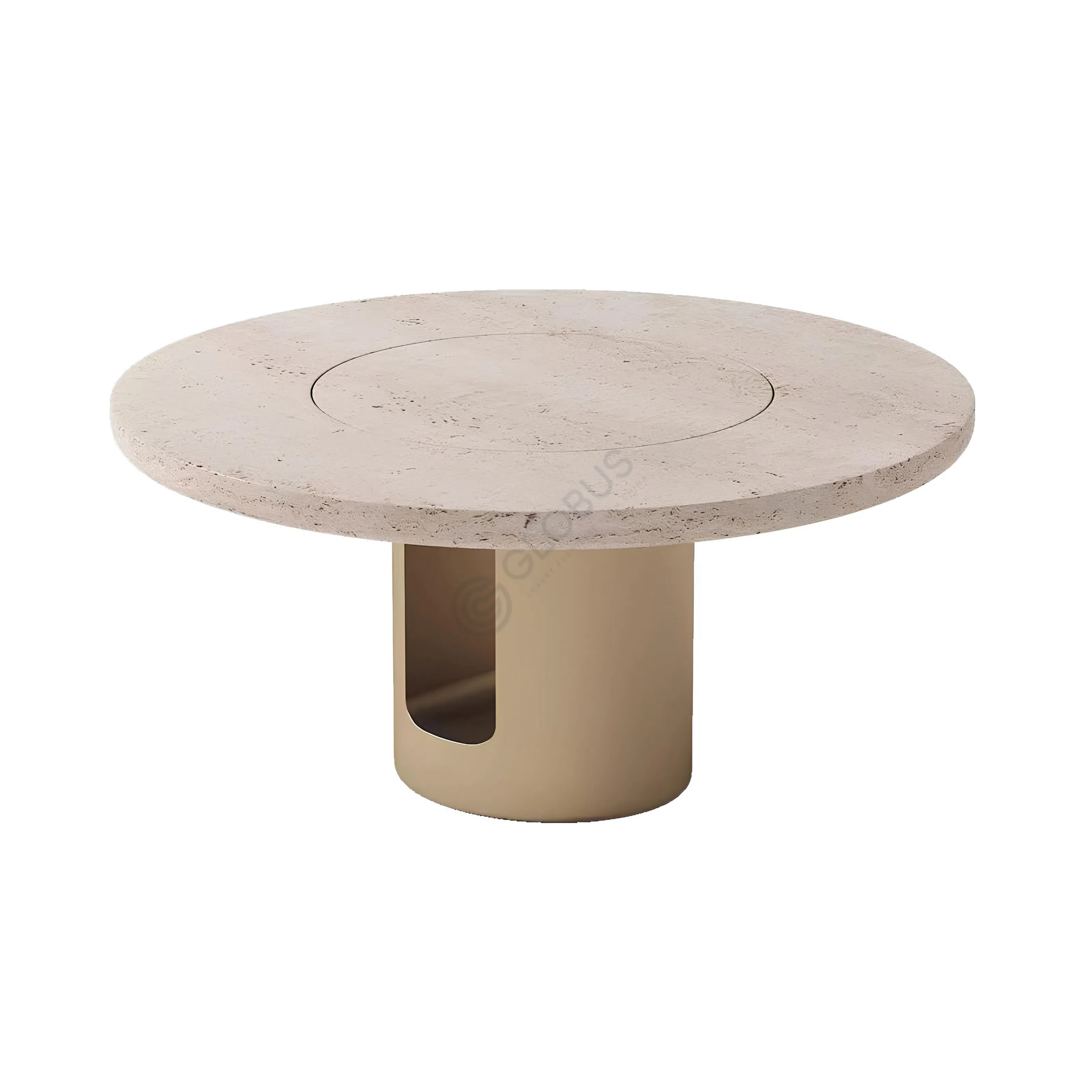 Круглая столешница выполнена из натурального травертина, притягивающего взгляд своей пористой, живой поверхностью и тёплыми, землистыми оттенками. Каждый элемент камня уникален, неся в себе отпечаток времени и естественной красоты, что придает изделию неповторимый характер и тактильную привлекательность.