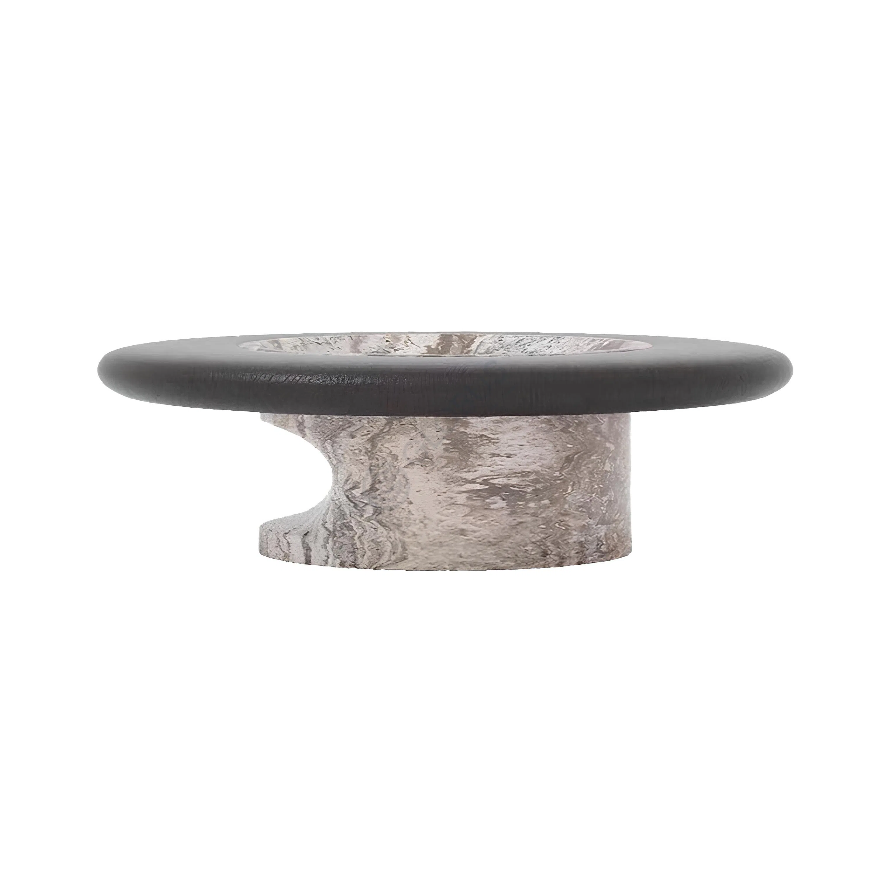 Основание предмета выполнено из натурального травертина, демонстрируя его неповторимую текстуру и светлые, естественные оттенки. Скульптурная форма подстолья, плавно изгибаясь, создает ощущение легкости и динамичности. Верхняя часть, созданная из фанеры и отделанная в темный тон, элегантно контрастирует с природной основой, придавая изделию завершенный и утонченный вид.