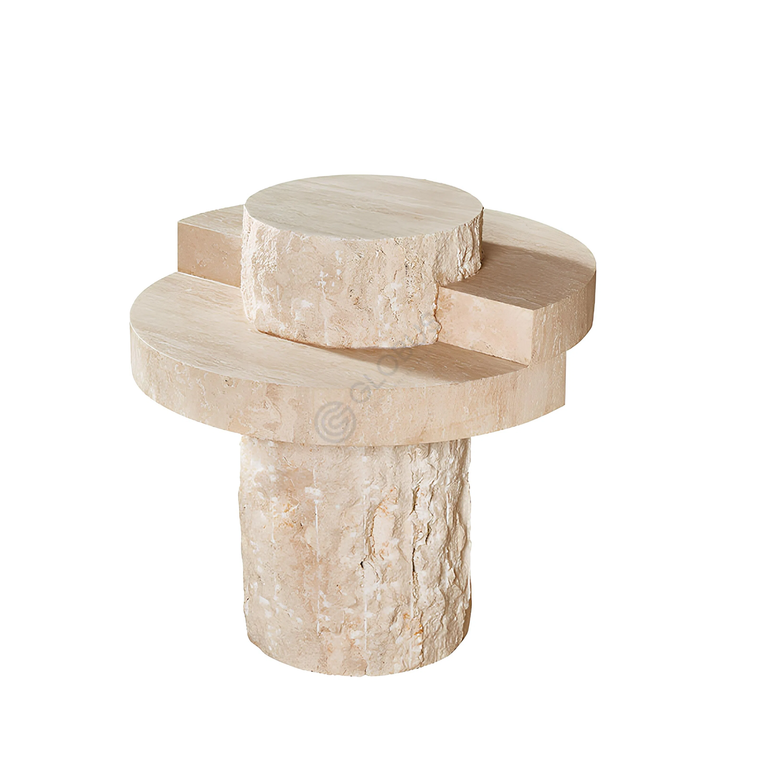 Уникальность объекта заключается в искусном контрасте его поверхностей: нижний ярус и основание демонстрируют необработанную, брутальную красоту камня с выразительными неровностями, напоминающими о его естественном происхождении. В то же время, верхняя столешница и одна из платформ выполнены с безупречной гладкостью, подчеркивая полированную элегантность травертина. Такое сочетание придает столику глубокое тактильное и визуальное измерение.