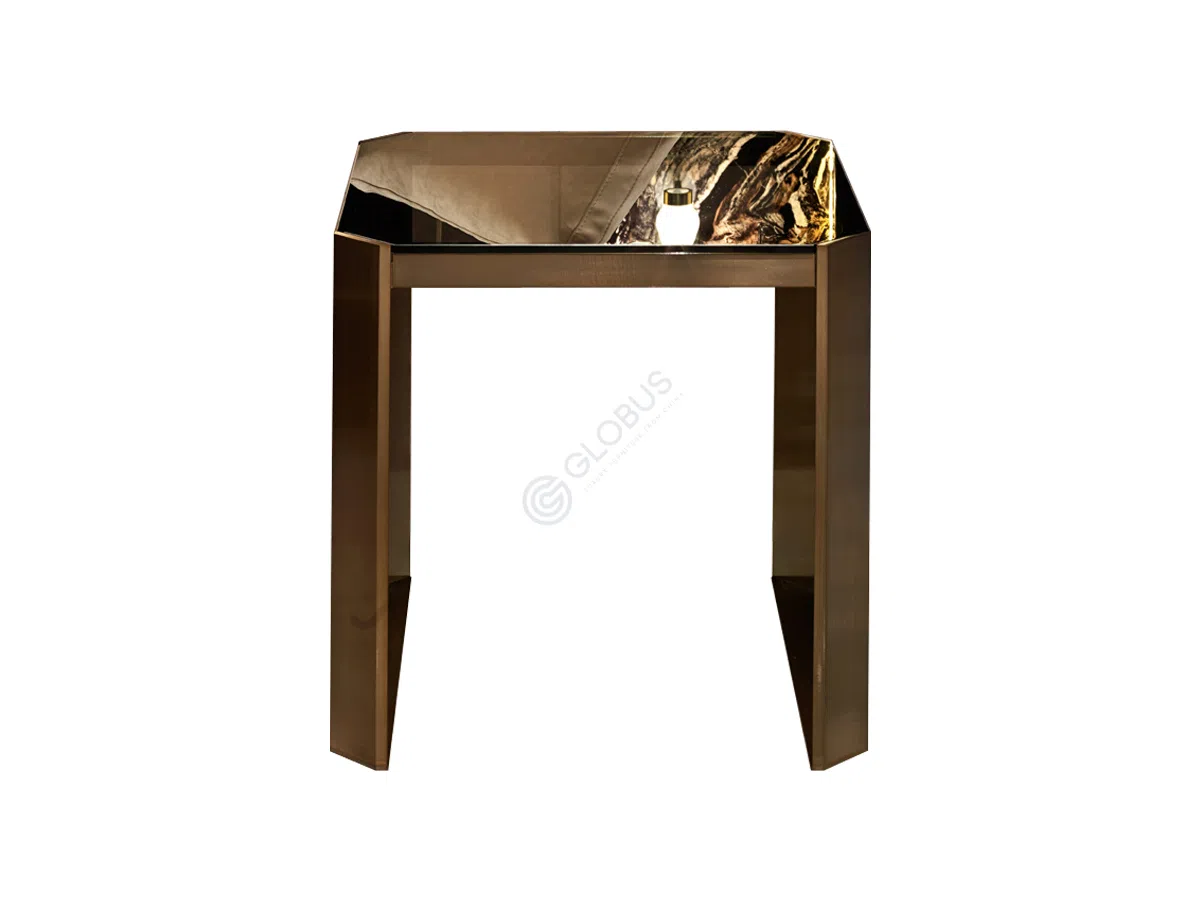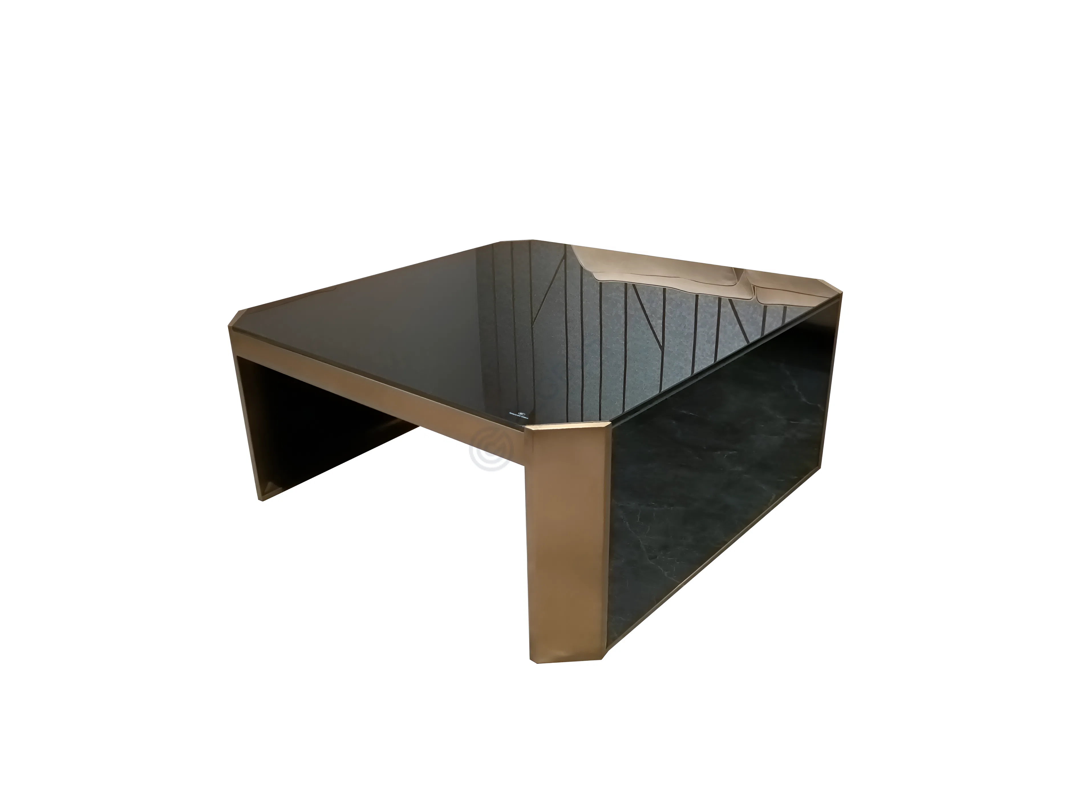 Изделие отличается уникальной многоуровневой формой, где каждый элемент создает динамичный и гармоничный ансамбль. Поверхность столешницы из темного стекла украшена тонким рисунком, напоминающим благородный мрамор, добавляя глубины и роскоши. Вертикальные акценты из полированной нержавеющей стали, с их теплым, благородным блеском, элегантно обрамляют прозрачные грани, создавая игру света и отражений.