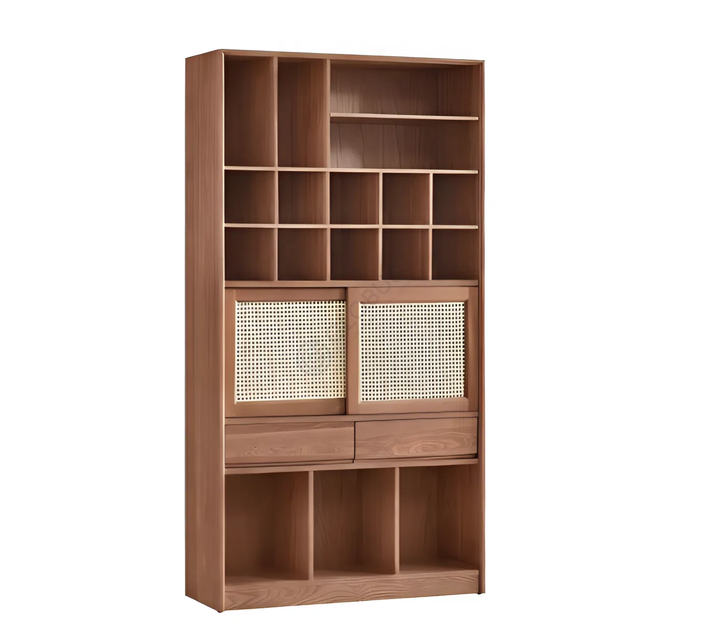 Функциональность предмета раскрывается через ритмичное чередование открытых ниш и закрытых секций. Изящные раздвижные дверцы, декорированные вставками из натурального ротанга, создают эффект визуальной легкости и обеспечивают мягкую циркуляцию воздуха. Центральная часть дополнена выдвижными ящиками с гладкими фасадами, позволяя аккуратно организовать хранение важных мелочей и документов.