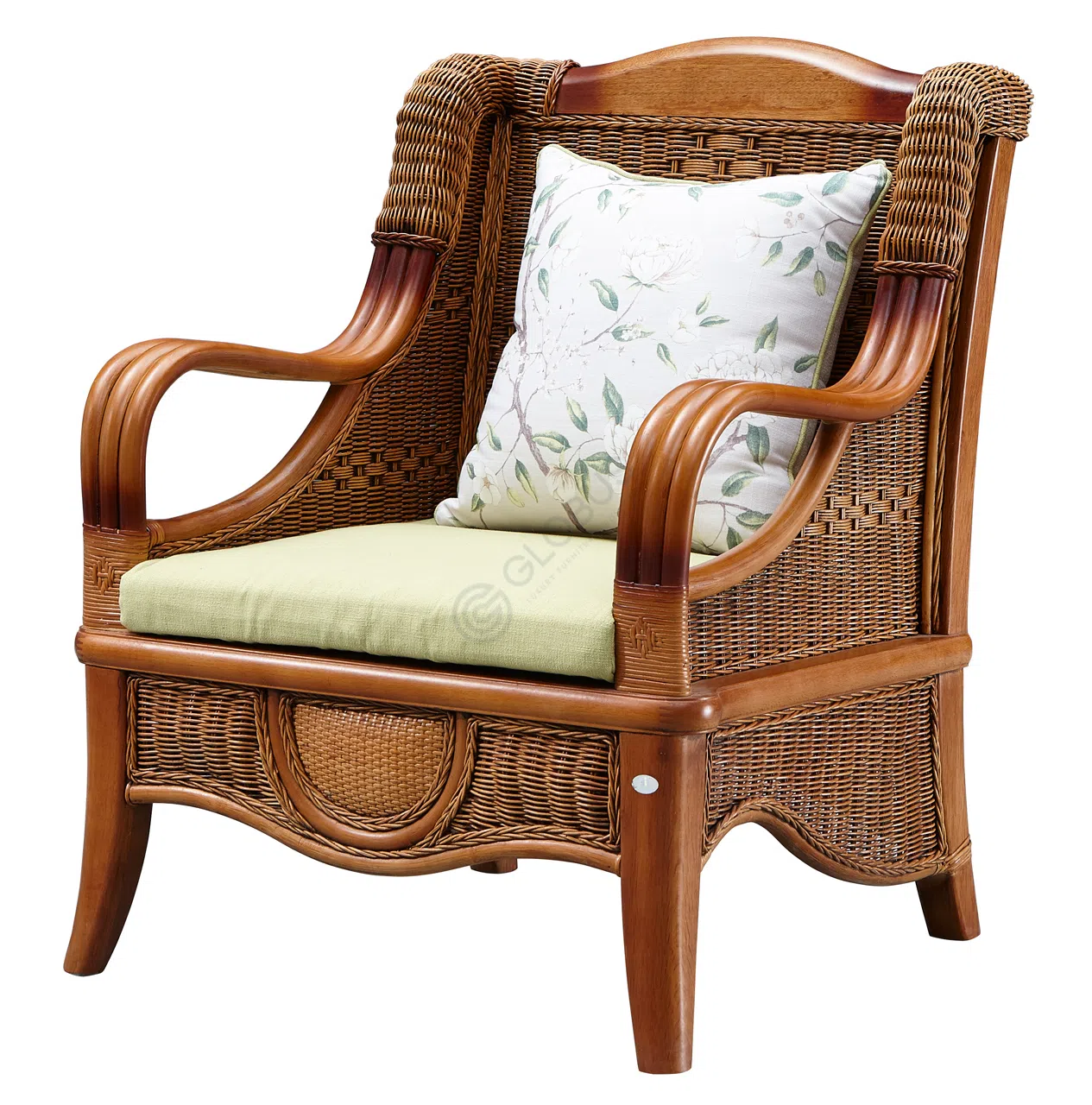 Для сиденья выбран качественный текстиль приятного оливкового оттенка, который идеально сочетается с теплой палитрой основы. Дополнительный комфорт обеспечивают мягкие подушки с деликатным растительным принтом. Продуманная эргономика и использование премиальных материалов делают этот предмет мебели прекрасным местом для отдыха, где эстетика встречается с повседневным удобством.
