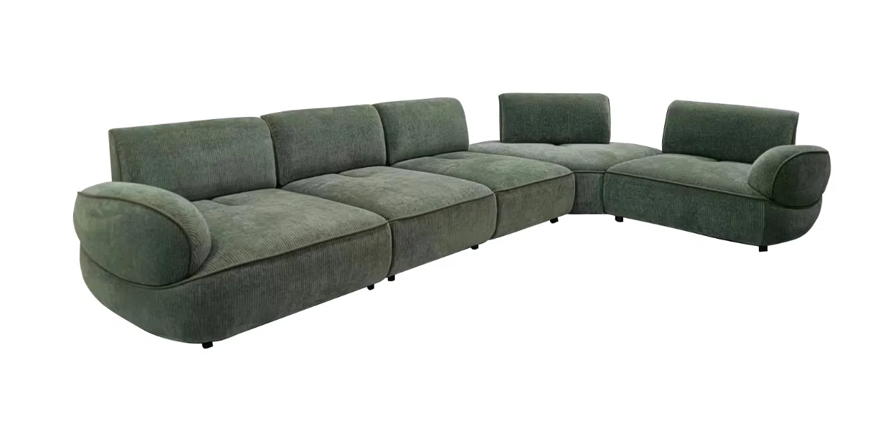 Современный диван с реклайнером в благородном текстиле глубокого зелёного оттенка выглядит цельно и элегантно. Низкая посадка, мягкие округлые подлокотники и аккуратные секции спинки формируют спокойный силуэт, который органично вписывается в гостиную или домашний кинотеатр.