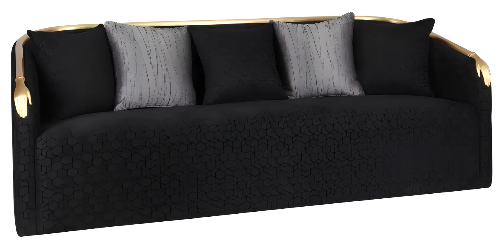 Особое внимание привлекает отделка из полированной меди, которая изящным контуром огибает верхний край изделия. Декоративный элемент в виде человеческих кистей, венчающий подлокотники, придает модели уникальный характер и превращает её в настоящий арт-объект. Темный текстиль с вертикальной фактурой, напоминающей природный рельеф, гармонично контрастирует с теплым блеском металла.